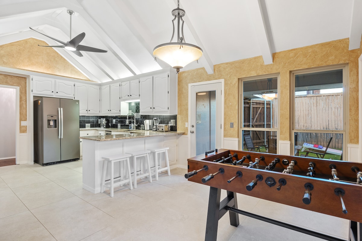 🔸 10 min walk to AT&T Stadium, Globe Life Field, Choctaw Stadium, Arlington Convention Center, Medal of Honor Museum, Texas Live & Esport Stadium 🔸 5 min to UT Arlington, Six Flags & Hurricane Harbor 🔸 15 min to DFW & Love Field airports 🔸 20 min to TCU, SMU, Stockyards AMENITIES 🔹 Pool table 🔹 Game room 🔹 Stocked kitchen 🔹 Basketball 🔹 Arcade games 🔹 Skee ball 🔹 Cornhole 🔹 Outdoor TV & fireplace 🔹 Outdoor kitchen 🔹 BBQ/flat grill/boiler 🔹 500 mbps wifi 🔹 Baby-friendly items