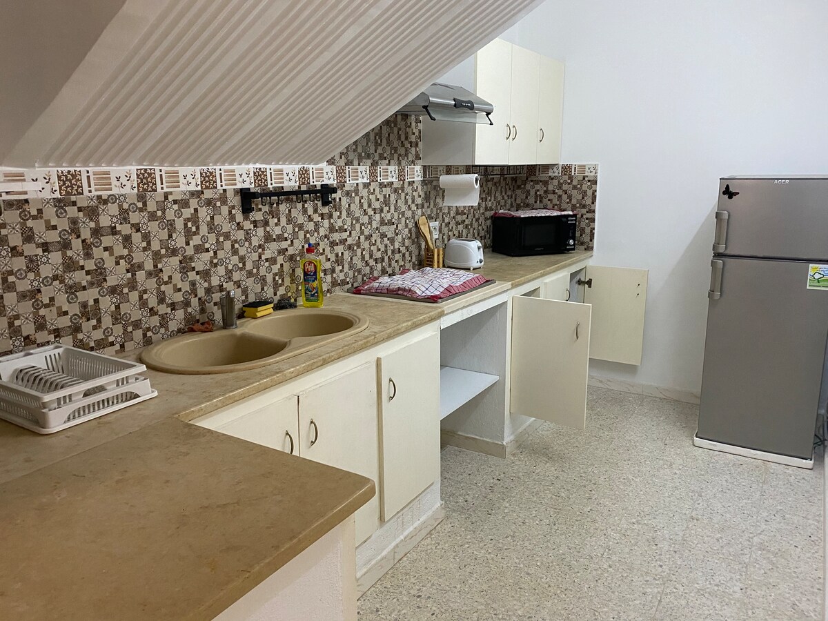 Mitten im Zentrum von Nabeul, 5 Minuten von der Bus und Louage Station entfernt, in einer der kleinen Nebenstraßen befindet sich dieses liebevoll eingerichtete Appartement mit allem was man braucht. Ruhig aber mittendrin findest du alles in deiner Nähe Carrerfour, Cafés, Patisserie & Reisehaltstellen sind alle innerhalb von Minuten fussläufig erreichbar. Zum Meer sind es 20 Minuten zu Fuß & der bekannte „Souk“ & die Töpferausstellungen sind in 10 Minuten erreicht. Küche vollausgestattet