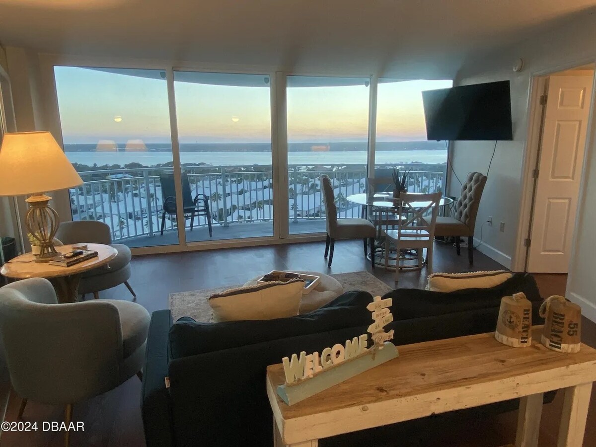 Umgestaltet und voll möbliert mit einem Kingsize-Bett und einem Queensize-Murphy-Bett und 2 Klimaanlagen, mit spektakulärem Meerblick durch die raumhohe und Wandfenster, auf dem berühmten Daytona Beach der Welt. Pool am Meer, Terrasse zum Entspannen und Tiki-Bar, kostenlose Parkplätze, in der Nähe von Restaurants, Bars, Supermärkten, Daytona International Speedway, Main Street, Ocean Walk, Golf, Bandshell, Angeln, Bootfahren,Pickleball und ist 1 Stunde von Disney Parks & Nasa entfernt