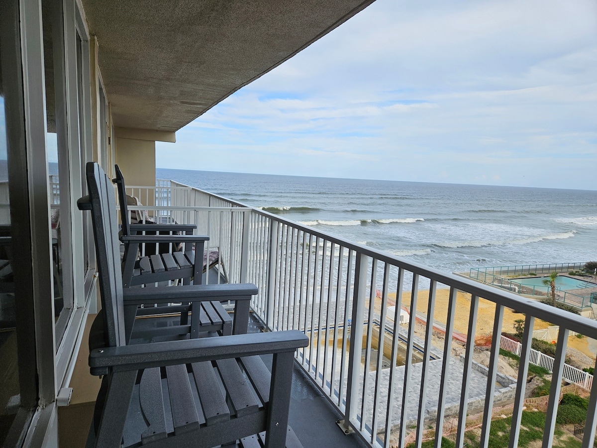 NIGHTLY PRICE REDUCED due to Building renovations restricting our balcony usage. There is no access to the balcony currently and the view will obstructed*. ON THE BEACH! Your very own cozy spacious studio in Daytona Beach Shores is the serene beach of Daytona and just a few short minutes away from a variety of activities and restaurants. Our 6th-floor unit is completely remodeled with free dedicated 45+Mbps WiFi, a full kitchenette, and free parking. *Balcony unavailable until March.