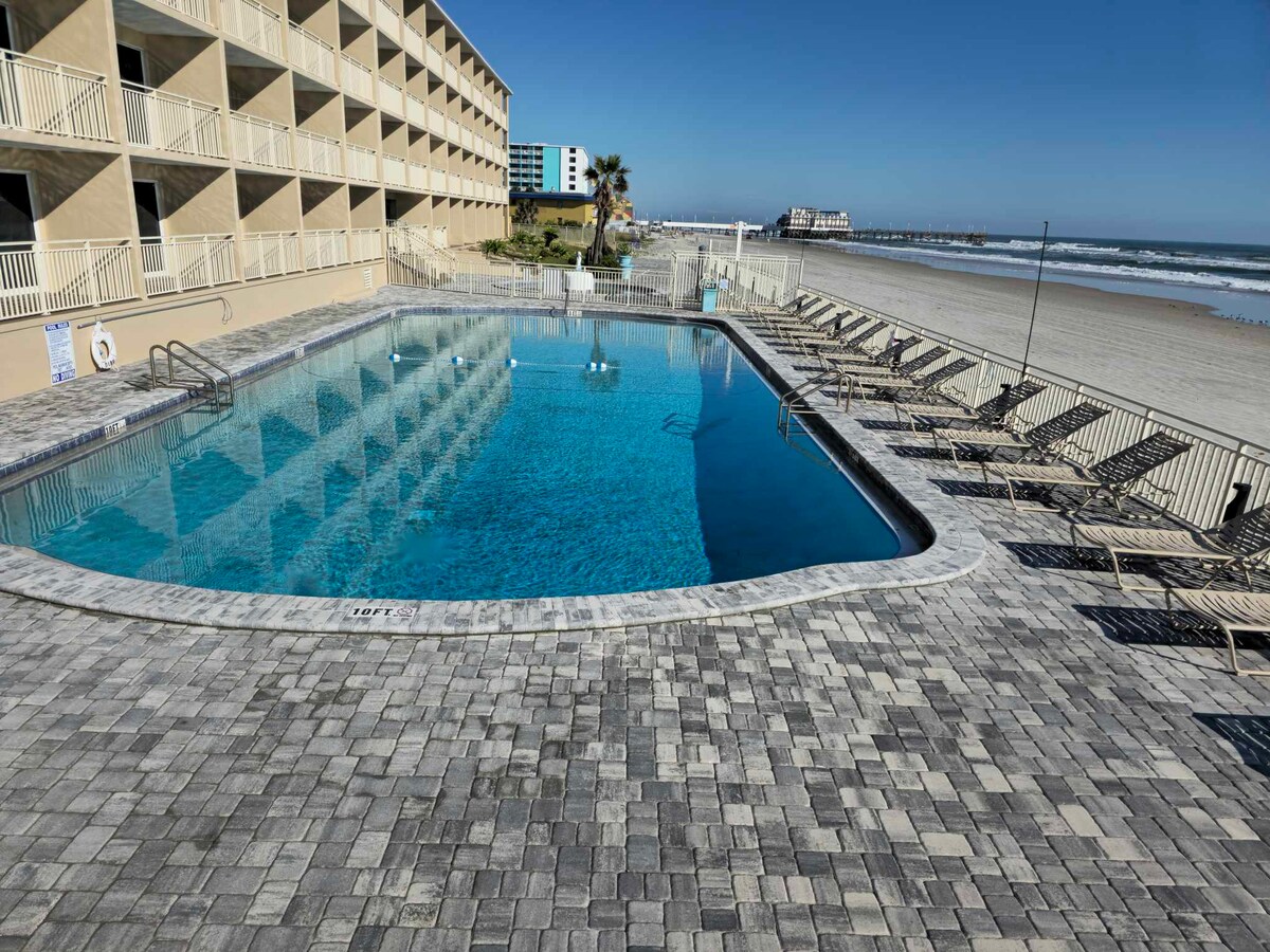 We are one of the closest airbnb to the boardwalk, OnThe Worlds Most Famous Beach with an open Pool 65inch Tv Come enjoy our Newly Furnished Studio with Amazing Top Floor Beach Views. We are the Closest AIRBNB on the Beach to the Daytona International Speedway With king bed and Queen sleeper sofa. Centrally located in the Heart of Daytona Beach. walking distance to the Pier Boardwalk, Restaraunts, and Main Street We have FREE parking for 1 vehicle and provide Coffee,Cream,Sugar,bch chairs.