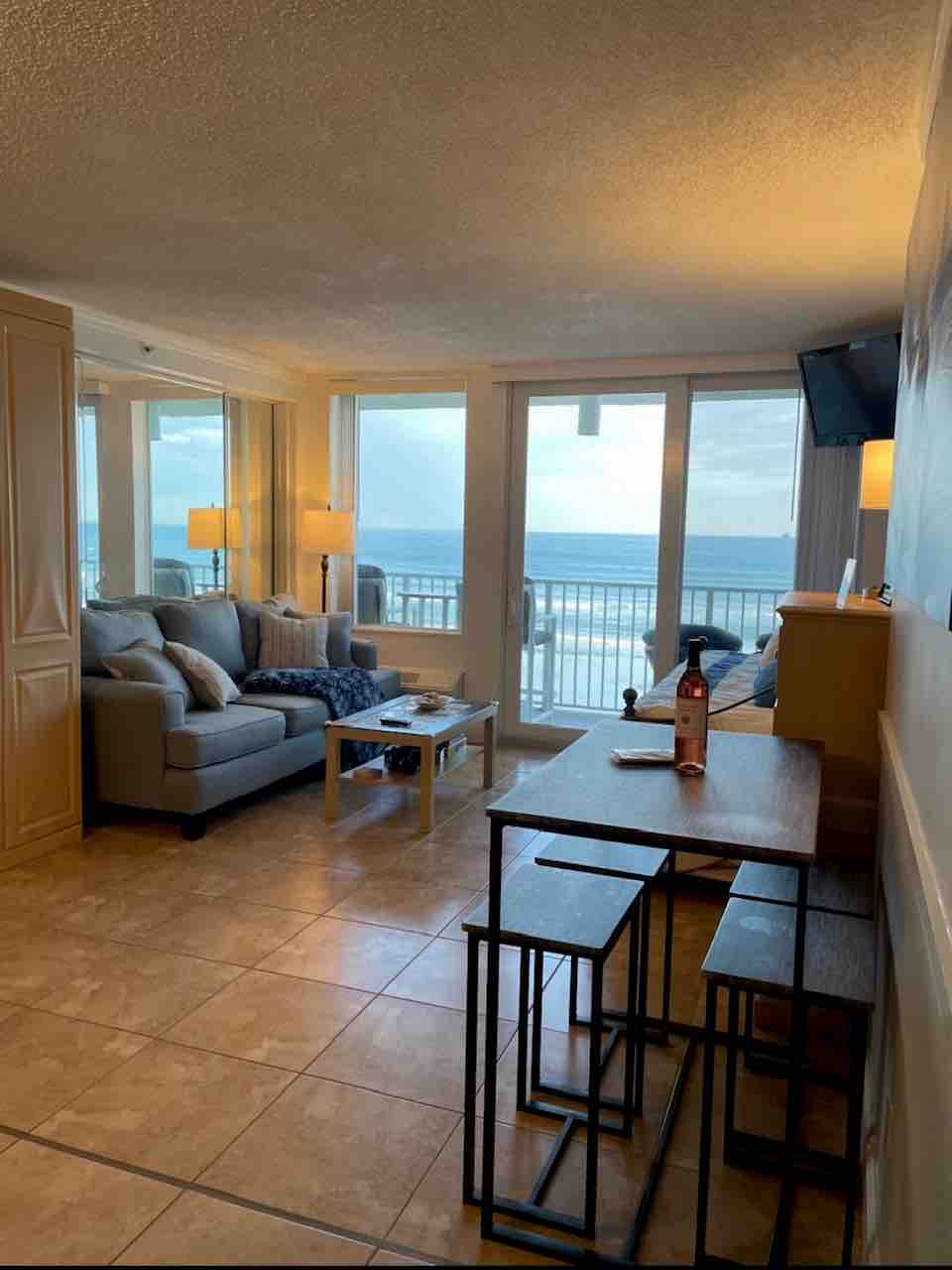Come and enjoy this oceanfront one bedroom condo on the 1st floor at the Daytona Beach Resort. This open concept offers a king bed, Full sofa sleeper, Fully equipped Kitchen, two Smart TVs, WIFI and Parking. Patio with two chairs and table to sit while you are enjoying a cup of coffee and experience the spectacular sunrises. *Update November 14, 2025: We are happy to share that the following amenities are open: *Outdoor North Pool *Indoor Pool *Jacuzzi *Fitness Room *Sauna
