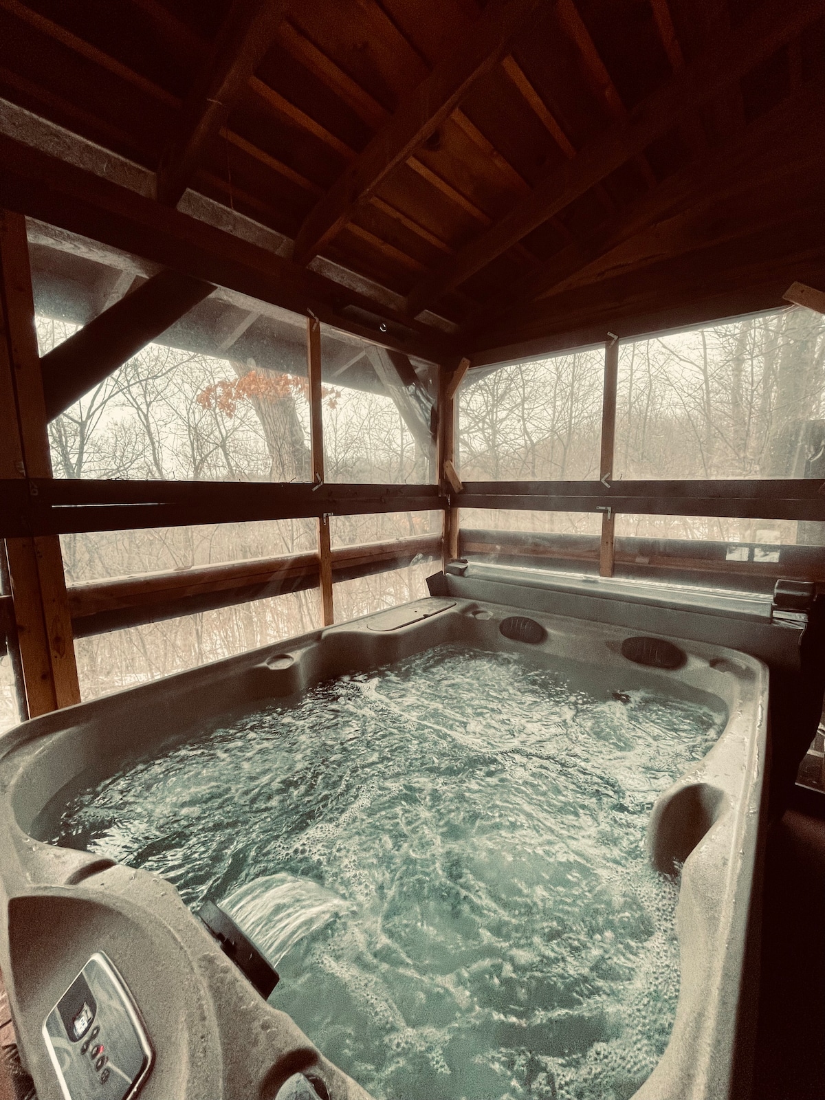 Experience a true off the grid stay at this little ridge top room! Everything you need and nothing you don’t-DVDs, books, games, AND hot tub. Enjoy the lovely setting of this romantic escape in nature. Sip your morning coffee in the hot tub, unplug from all the noise and enjoy a breathtaking sunset. The views of the Mississippi are just stunning! Decorated for Christmas mid November through mid January! See all 7 properties with Hot Tubs at Rentals Justin Time.