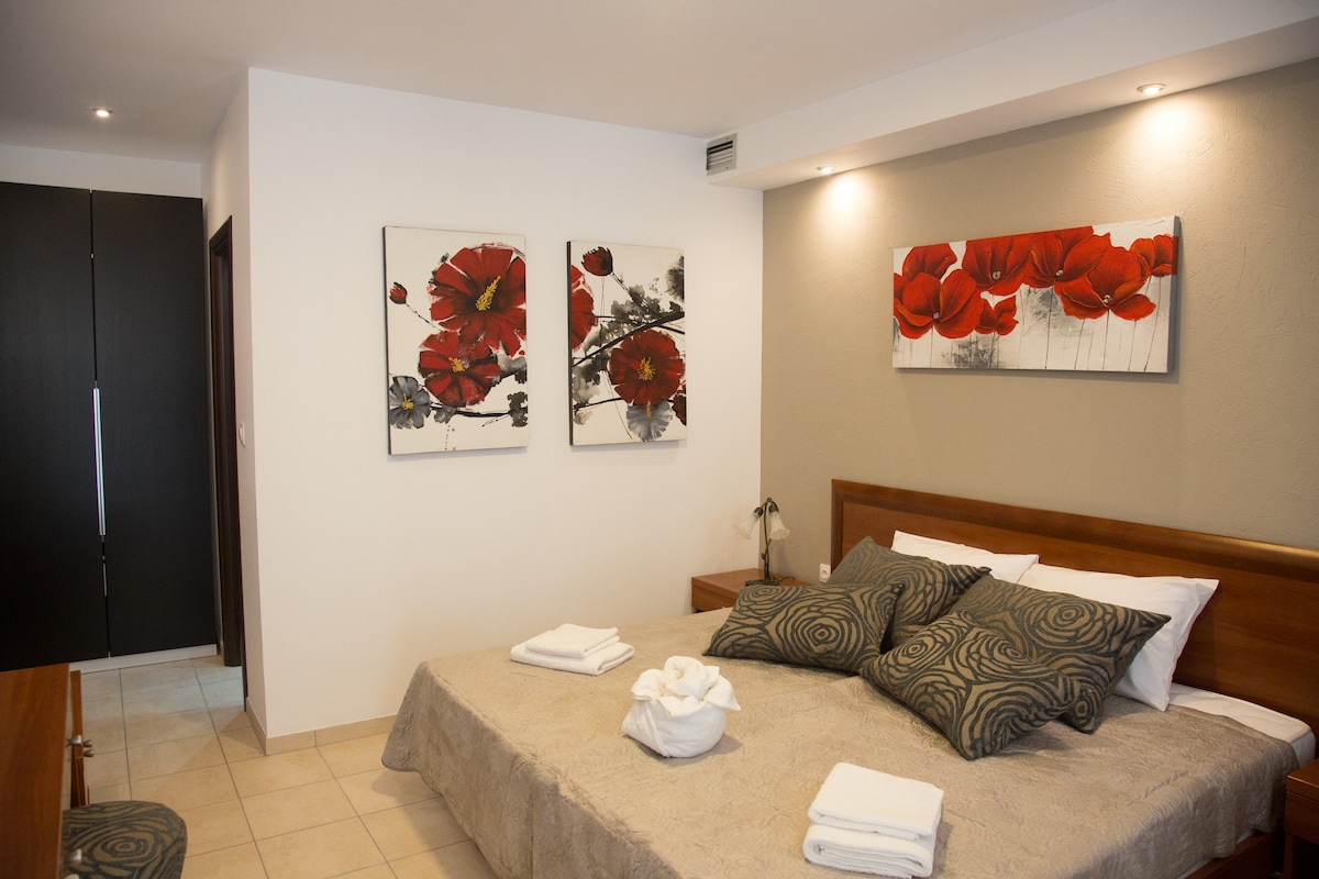 Eine schöne Familienwohnung mit zwei großen Schlafzimmern mit Meerblick, voll ausgestattete Küche, Bad mit Dusche und zwei Balkonen, eines mit Meerblick und das andere mit Blick auf den Garten, vor dem Sandstrand und dem Meer von Marathonas Dorf. In einem schönen Garten mit Blumen und Pistazienbäumen.Die Wohnungen sind ca. 55 qm groß und es ist perfekt für Familien ( 2 Erwachsene und 2-3 Kinder), Paare oder Freunde ( 4 Erwachsene).