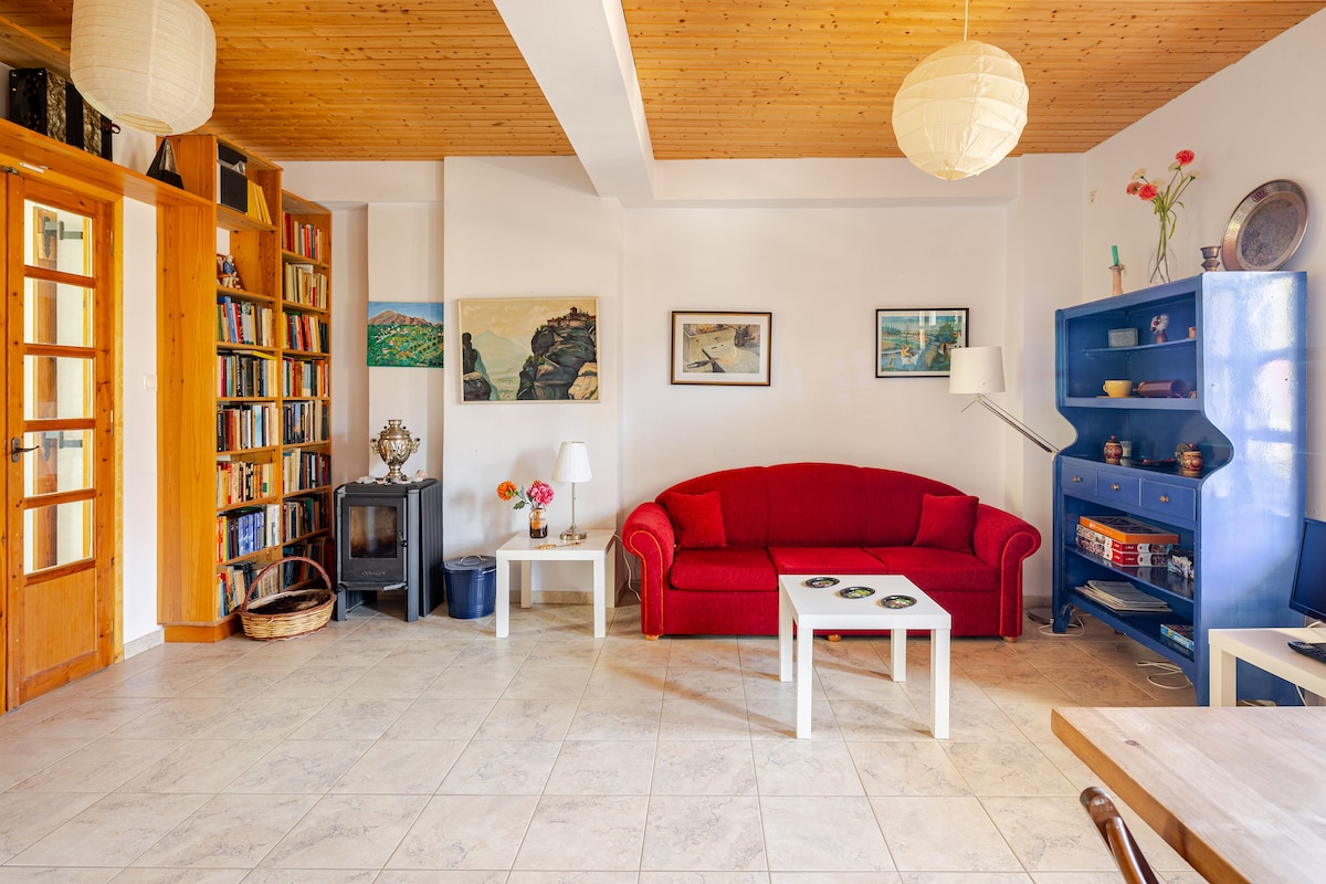 Two-storey house with loft, 108 m² build of stone and wood at the first village of Pelion,Agria. 80 meters from the beach, 7 km from the center of Volos and 19km from Pelion ski center. Outside stone BBQ for the sunny days and fireplace inside for the cold ones.