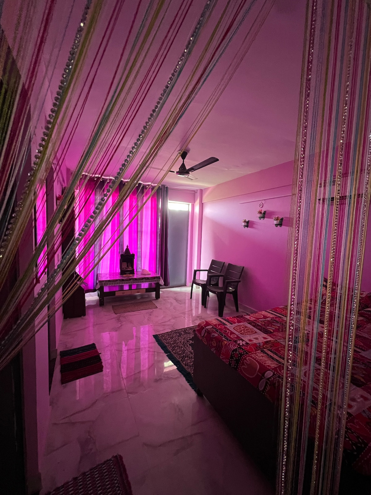 Radhey Radhey Peaceful, Artsy Family Retreat in Vrindavan Tastefully designed studio blending Indian heritage with modern comfort Just 10–15 minutes from Prem Mandir, ISKCON & Banke Bihari Temple Calm, soulful interiors ideal for relaxation or spiritual rejuvenation Cozy balcony overlooking a serene garden — perfect for morning tea or meditation Suitable for families and couples seeking a peaceful getaway Affordable pricing for a comfortable and enriching stay ₹400 extra for 3rd adult