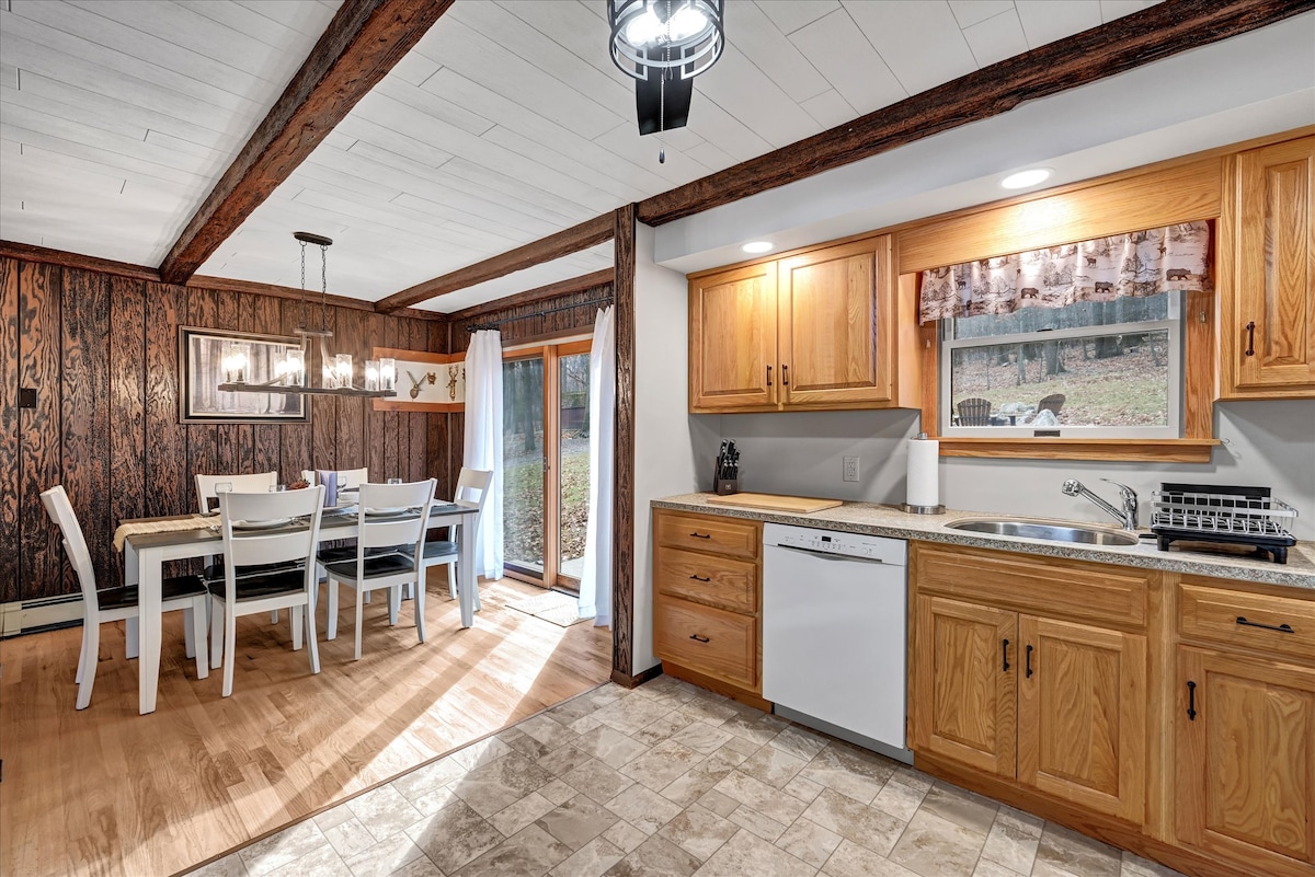 Quiet wooded setting for authentic log cabin: *Self-contained wooded area. Owners live nearby. Other homes visible in winter. *1/2 mile country dirt road passes homes on way to cabin. Please drive slowly! *Signs along road after GPS leaves off. *Parking area turn around. *Complete bathroom *Kitchen: convection oven/ air-fryer/ microwave combo, Keurig, toaster, under counter frig. / small freezer. *Loft queen bed *Double Futon *Pots, pans, utensils *Table service for 4 *Games, books