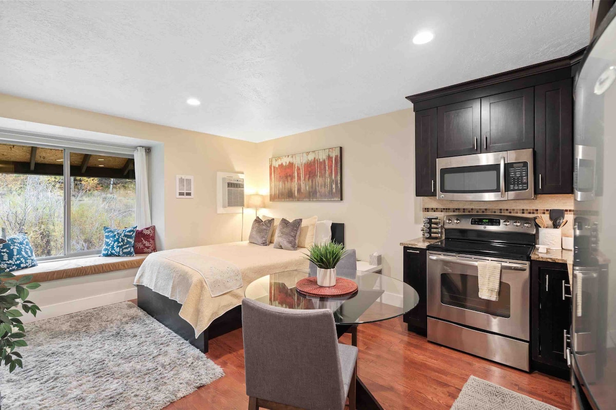 LAGE LAGE!! Keine Sorgen um den Verkehr oder die Reservierung/Bezahlung des Ski-Parkplatzes... Sie sind hier! Ski zu/von Quitn' Time, über die Stadttreppe zum Skifahren hinunter zur Skifahrerbrücke/Stadtlift. Schneller Wander-/Fahrradzugang zu den Sweeny & Mother Urban Trail Heads. Einfacher Zugang zur Main St, 2 Blocks hinter No Name Saloon und allen Festlichkeiten, Restaurants und Nachtleben. Alles weniger als 5 Minuten zu Fuß. Super süßes 1969 (ausgezeichnet) zeitgenössisches Ski-Chalet Apt auf der begehrten Upper Woodside Ave.