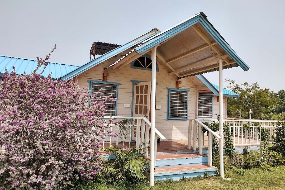 Luxury B&B Redefined *************************** View All Cottages - Search - Chateau de Tatli *************************** ** Breakfast Included ** This is our premium Suite Cottage Overlooking the Song river, the International Cricket Stadium and majestic Himalayan range. Get submersed with Nature (various birds & butterflies keep visiting the property, also if you are lucky then Fireflies will light up the area) FOC: Stargaze Fresh Air Trek | Walk around Meditate
