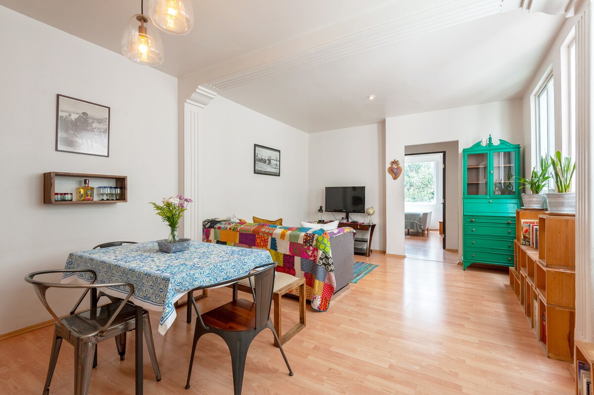 Geräumiges, gemütliches, helles Apartment mit hohen Decken, ideal für bis zu 4 Personen. Gut gelegen im Zentrum der Stadt in Colonia Del Valle, einer der schönsten Wohngegenden der Stadt, aber dennoch nah an allen wichtigen Gegenden und Sehenswürdigkeiten wie Coyoacán, Condesa, Roma, Nápoles und dem Stadtzentrum. Wir haben einen Stadtführer mit unseren Lieblingsorten in der Gegend und in der Stadt erstellt und stehen dir während deines Aufenthalts jederzeit zur Verfügung, um bei allem zu helfen. Perfekte Lage, um alles zu erkunden, was die Stadt zu bieten hat!