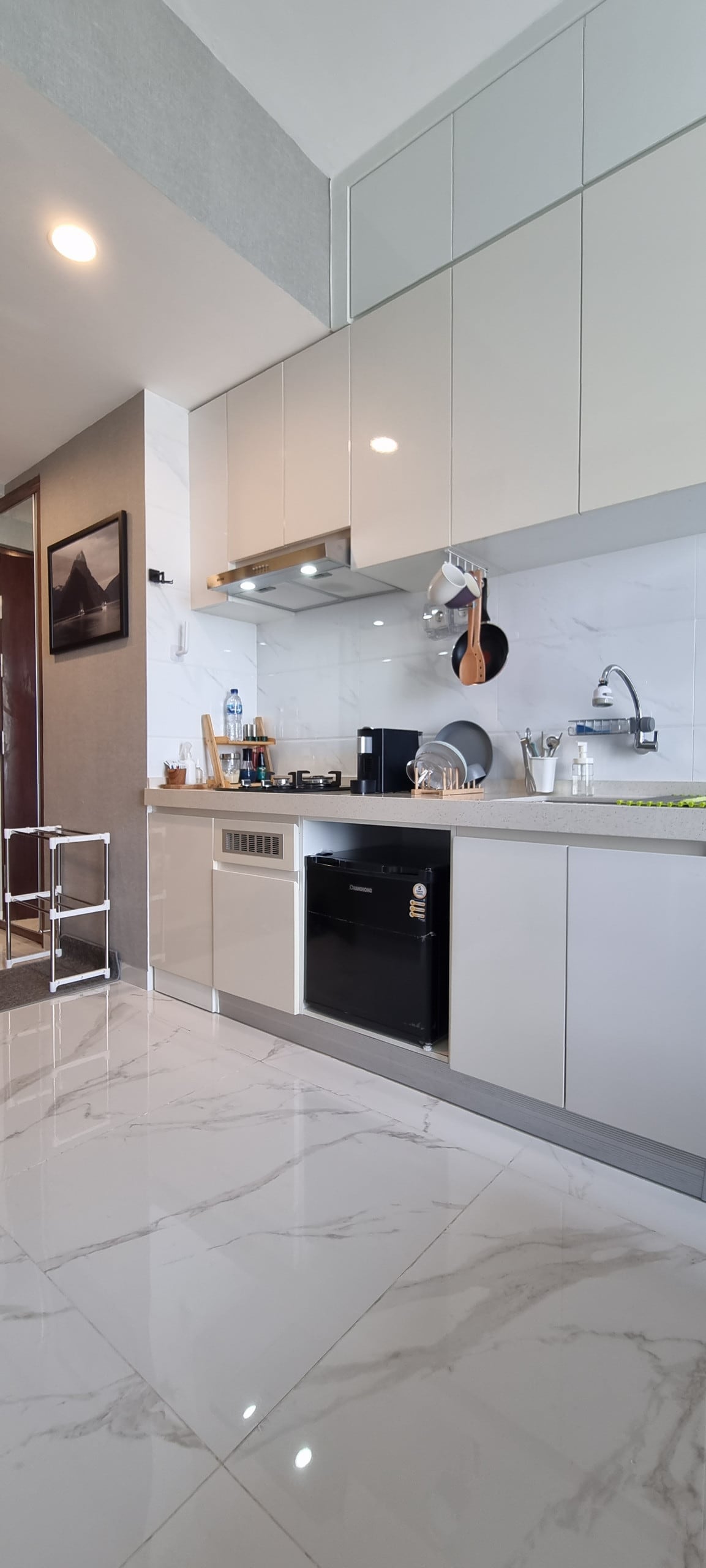 Komfortable, saubere und strategische Apartments im Viertel Mall mit 24-Stunden-Sicherheitseinrichtungen, Zugangskarten, Aufzügen und Swimmingpools. Besteht aus 2 Schlafzimmern (1 Queensize-Bett+Schlafsofa und 1 Einzelbett), Wohnzimmer, Esszimmer, Küche und 3 Badezimmer. Vom Wohnbalkon genießen Sie einen schönen Blick auf die Stadt, der täglich und wöchentlich gemietet werden kann. Jedes Zimmer ist modern eingerichtet. Zusätzliche Matratze für 75.000 Rp/Tag verfügbar
