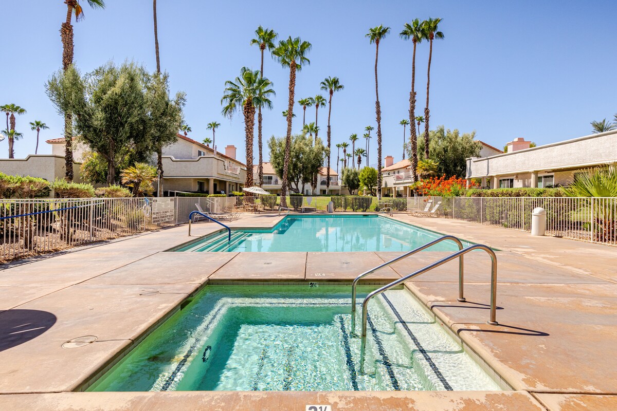 This colorful, contemporary 2BR/2BA lower-level condo is your perfect Palm Desert retreat 🌴. Steps from a sparkling pool + hot tub, the space is fully furnished with everything you need to relax and recharge. Enjoy sunset mountain views from the back patio, gathered around the fire pit in your own private, lush oasis 🔥⛰️. We love furry friends 🐾. A $150 non-refundable pet fee per pet is added at booking. A Pack ’n Play + high chair are also available in-unit for little ones.
