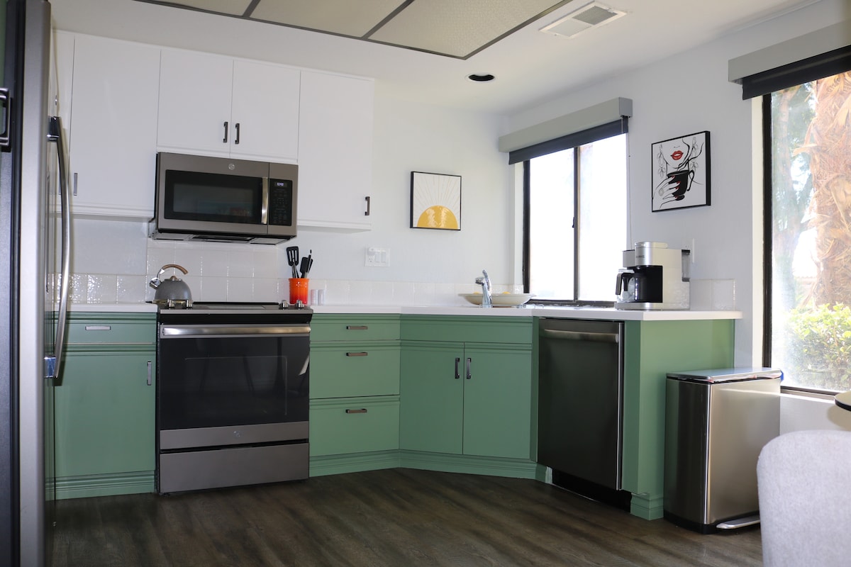 Enjoy a vacation getaway in the south of Palm Springs, minutes away from downtown! From the floors up - new porcelain tile floors, new double shower and vanity in the bathroom, brand new stainless steel kitchen appliances, cabinets, and backsplash. Also, everything you need for a week or monthly stay provided. 65” 4K LED TV w/ internet at 400Mbps, Sling TV, Netflix, Hulu, Amazon Prime Video, HBO, Showtime, and Starz, Nest thermostat, & August smart lock technology for security. City ID# 1696
