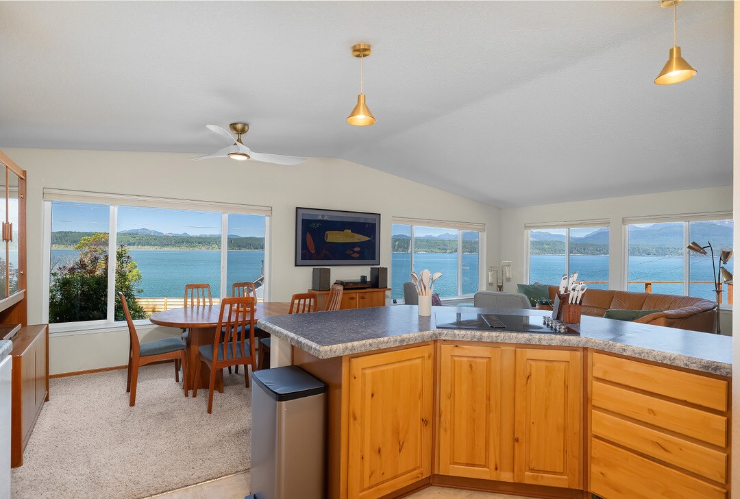 Dieses 1.800 Quadratfuß große Haus liegt auf dem Harrison Hill in einer ruhigen Wohnsackgasse und verfügt über einen offenen Grundriss mit großartigem Fluss. Der Blick auf den Hood Canal und die umliegende üppige Vegetation machen dieses Haus zu einem ruhigen Rückzugsort und einem unterhaltsamen Treffpunkt. Eine große umlaufende Terrasse, eine Feuerstelle, ein saisonaler Pavillon und ein Essbereich im Freien bieten einladende Unterhaltung im Freien! Charmante Geschenkläden, Restaurants, Cafés, Weingüter und eine Brennerei am Hood Canal sind nur einen kurzen Spaziergang den Hügel hinunter entfernt!