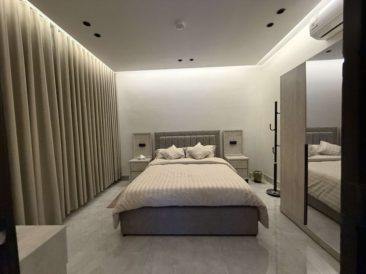 Entspannen Sie sich in dieser ruhigen und stilvollen Unterkunft. Moderne luxuriöse Executive-Suite mit eigenem Eingang. Bestehend aus: Schlafzimmer, Wohnzimmer, Badezimmer. Für ein besseres Erlebnis wurden alle Annehmlichkeiten wie ein bequemes Sofa und Bett sowie Bedürfnisse wie: 50-Zoll-Smart-TV - stc tv - Netflix - schnelles Internet - Kaffeemaschine - Wasserkocher - Tee - Bügeleisen - Shampoo - Lotion - Seife - Handtücher - Servietten bereitgestellt.