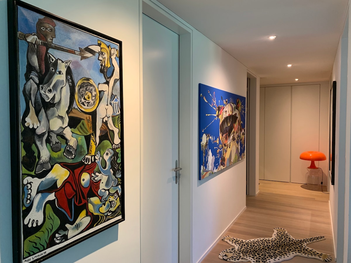 Diese einzigartige Loft liegt 13 Autominuten vom Airport-ZH und 20min. von der Stadtgrenze Zürich entfernt. Die Gegend ist ländlich, mit Wäldern und einem Fluss direkt beim Haus. Die Loft ist 280m2 gross und komplett mit allem ausgerüstet. Es fehlt hier an nichts. Die Betten im oberen Stock sind von feinster Qualität und auch die Sanitären Anlagen. Der untere Stock ist 200m2 gross und beinhaltet ebenso eine Schlafmöglichkeit für 2 Personen. Wintergarten und Terrasse sind im 3. Stock.