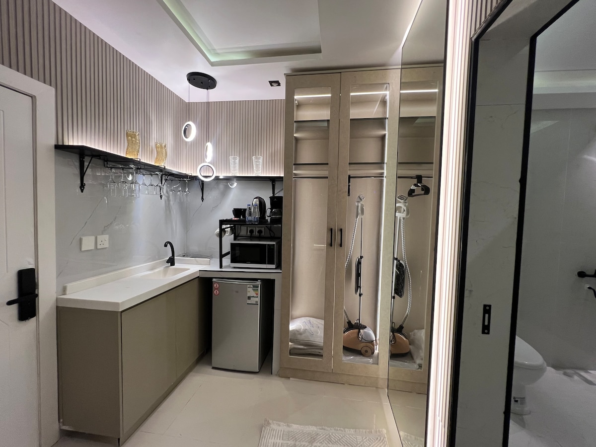 Erlebe ein einzigartiges Erlebnis in einem privaten Künstleratelier, das Entspannung und Komfort bietet. Das Studio verfügt über ein Bett und einen seitlichen Sitzbereich, in dem du auf einem 65-Zoll-Smart-Bildschirm. Es gibt auch eine separate Küche und einen Kaffee, um alle deine Bedürfnisse zu servieren, und einen stilvollen Außenbereich mit Feuerstelle. die Lage ist in der Nähe aller Dienstleistungen, des Touristenziels und der Saison von Riad (Boulevard,Arena usw.) innerhalb von 5 Minuten. Wir würden dich gerne als Gastgeber begrüßen und die Erfahrungen mit uns teilen!