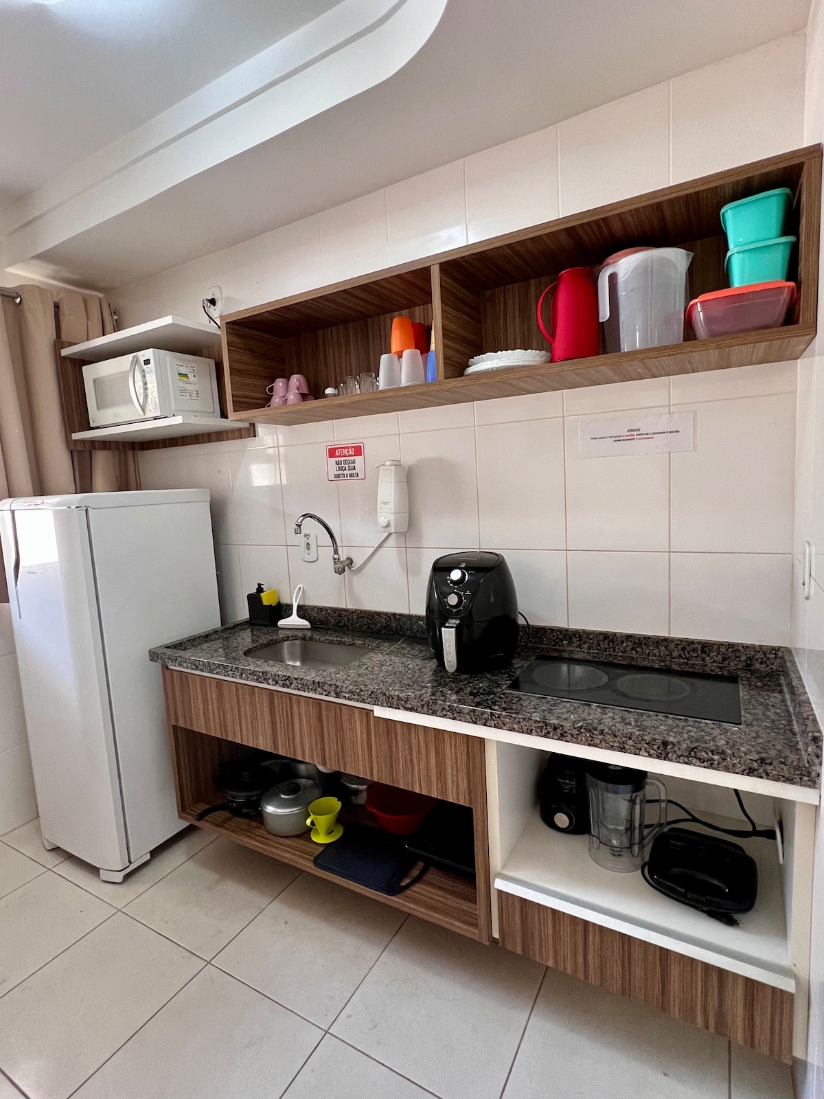 Apartamento Suíte casal com cama box Queen, ar-condicionado, TV, armários, criados e cortina com black-out; Quarto solteiro com cama box Queen, criados, armário, ar-condicionado, e cortina com black-out; Banheiro social com armários e box no banho; Sala com sofá, TV de tela plana, bancada com 4 cadeiras e banqueta; Cozinha tipo americana com Cook Top a gás, geladeira inox, micro-ondas, forno elétrico, sanduicheira e utensílios. Sacada com bancada . Garagem privativa.