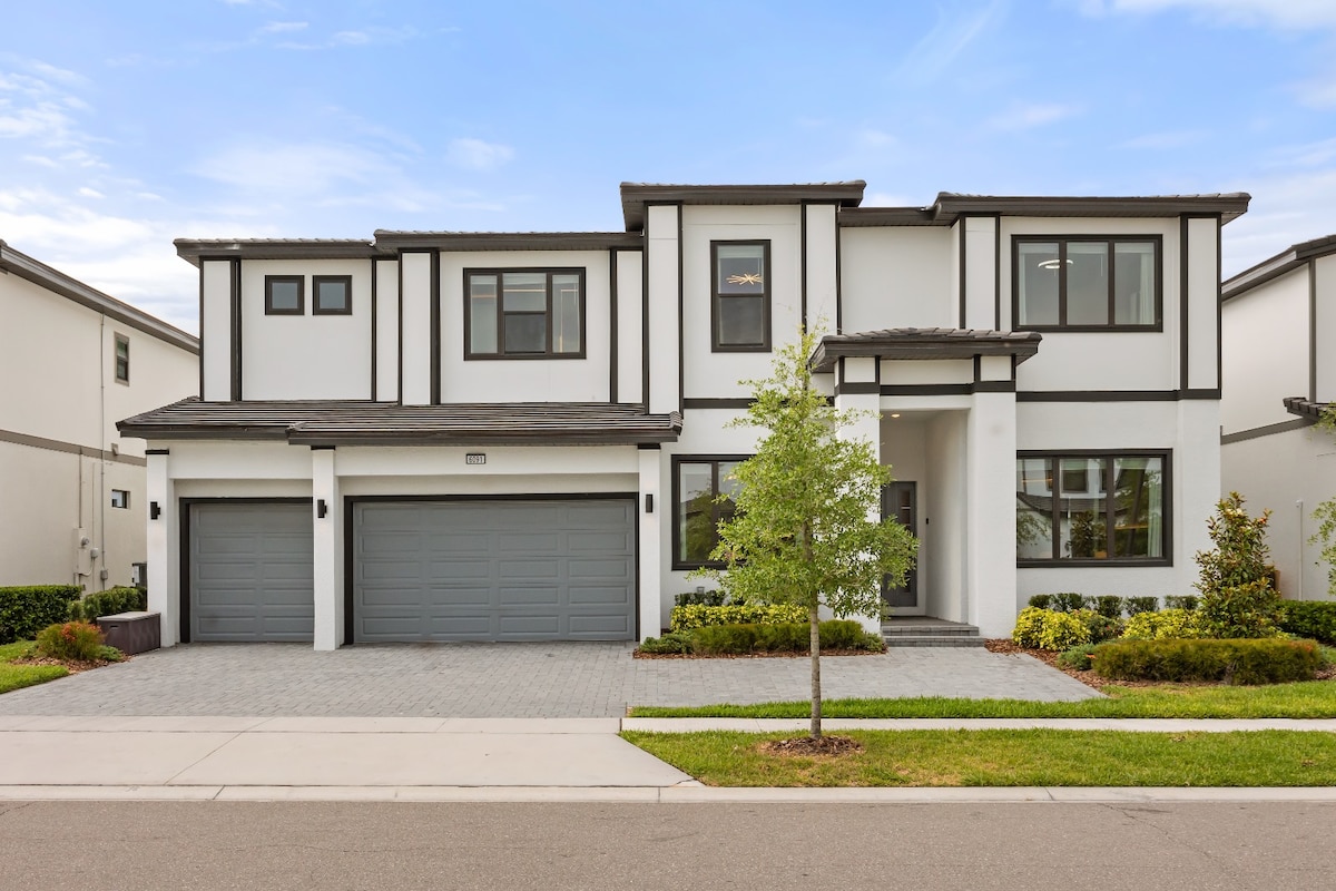 Enjoy a stylish experience at our Luxury Modern Villa! - 2,913 sq ft 2-story upscale modern home inside a gated resort - 5 EN-SUITE bedrooms - Outdoor kitchen for a family BBQ - Private Screened Pool - Safety gate around the pool - Fully equipped kitchen with top of the line appliances - Movie Room & Arcade Games - Themed Bedrooms - Incredibly located just around the corner from Sea World, easy access to Disney and Universal