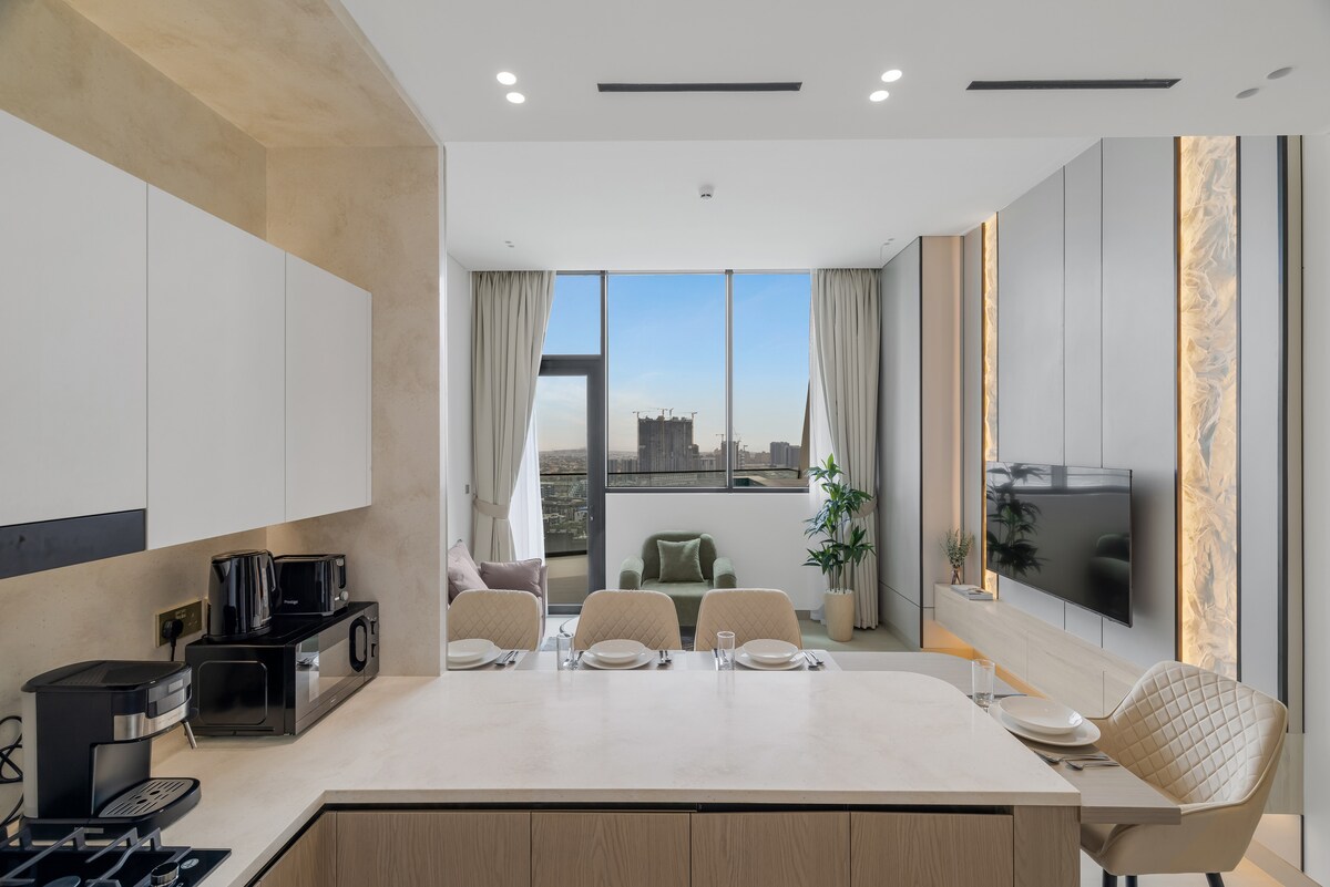 Ziehen Sie sich in dieses gemütliche Refugium auf der 30. Etage zurück und genießen Sie den atemberaubenden Panoramablick auf Dubais Skyline, die Küste und Sehenswürdigkeiten wie den Burj Khalifa. Dieses luxuriöse Haus verfügt über einen Tauchbecken auf dem Balkon, ein modernes Interieur und eine ruhige Atmosphäre. Durchdacht ausgestattet für einen reibungslosen, entspannten Aufenthalt zu zweit – der perfekte, gehobene Rückzugsort im Herzen der Stadt.