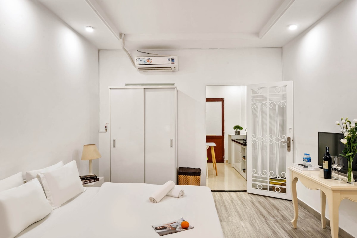 【Urban Oasis】 Luxury Studio in Ho Chi Minh CBD | 45 m² Panoramablick | 5 Min. Lifestyle-Hub 🏙️ Die Highlights: • Top-Lage: 2 Gehminuten zu Cafés/Restaurants/Lebensmittelgeschäften, 5 Minuten zum Supermarkt, 600 m zur Pink Church • Premium-Wohnen: raumhohe Fenster, Samsung Frame TV, Emma-Matratze, Smart Lock + 24/7 Sicherheit • Arbeitsbereit: 200 Mbit/s Glasfaser, 1,5 m Arbeitsbereich • Vergünstigungen: Kostenloses Parken für Motorräder + Reinigung alle zwei Wochen (nur bei Langzeitaufenthalten) 🔑 Smart-Check-in: APP-Fernzugriff + Schlüsselbox
