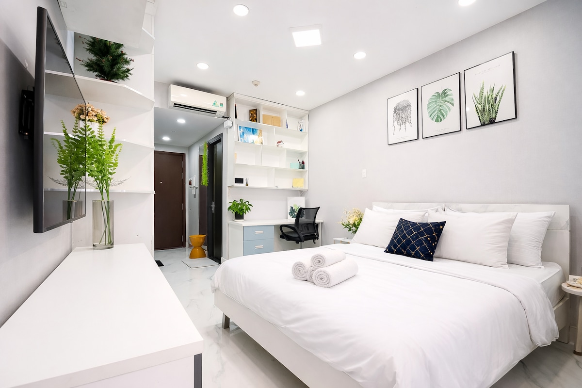 A rare find studio in Delasol - 55 inches TV - River View - Fully equipped kitchen Host do deep clean every check out We commit to wash bedding by OMO detergent, safe for skin. No bleach! We wash bathroom by soapy and hot water from the wall to the floor every check out, not just spray and wipe. Therefore, the clean will not be done faster than 2 hours.