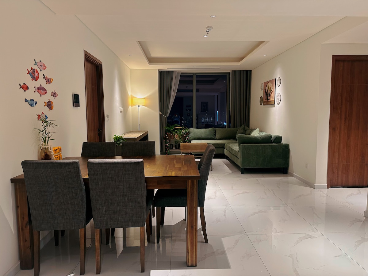 👉Ich mag Privatsphäre und Ruhe für meine Reisen, nur ein bisschen Reisen, um ins geschäftige Zentrum zu gelangen. Zenity ist also die beste Wahl für alle, die wie ich denken. 2-Zimmer-Wohnung mit 👉 2 großen Betten, die für diejenigen geeignet sind, die Privatsphäre benötigen. * KOMFORTABLE Bettwäsche, HOCHWERTIGE AUSSTATTUNG * Blick auf den Sai Gon/Skyline der Stadt * KOSTENLOSER Pool/Fitnessraum/Arbeitsplatz/Luxushalle/Whirlpool * KOSTENLOSER Abholservice vom Flughafen für Buchungen ab 7 Nächten * KOSTENLOSES WASSER TÄGLICH * KOSTENLOSER täglicher HANDTUCHWECHSEL auf Anfrage. * Netflix