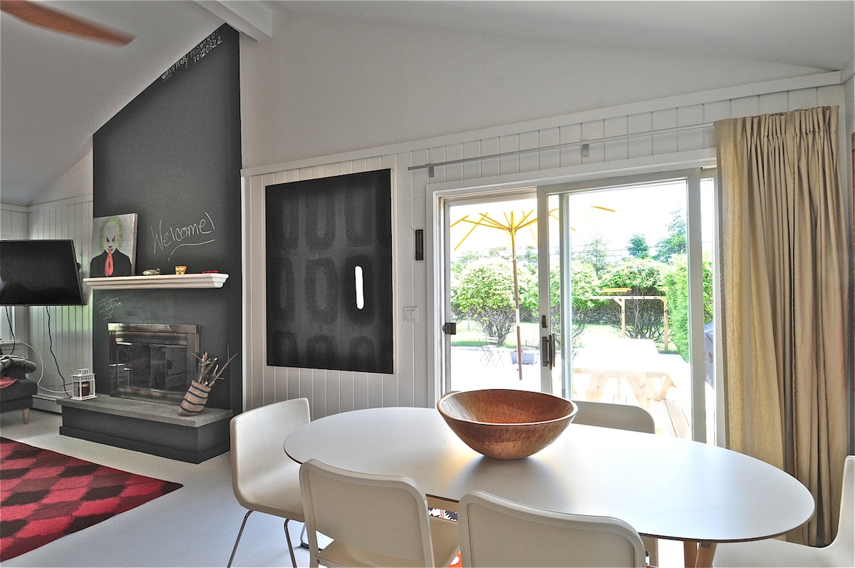 Scandinavia meets Montauk in this sophisticated, comfy, all-season getaway with open-plan interior & large, private fenced yard. • 950 sq ft, 2 BRs (compact but comfy), 1 Ba, full high-end kitchen, W/D, A/C • Wood stove, Solo stove, patio, outdoor shower, high-end linens & furnishings/decor • Steps to LI Sound & Harbor. 3 mi to ocean/Town • Owner is in a private studio w/ own entrance in the house. No shared spaces! • Ask about dogs & flexible rental periods CLICK MORE for IMPORTANT INFO!