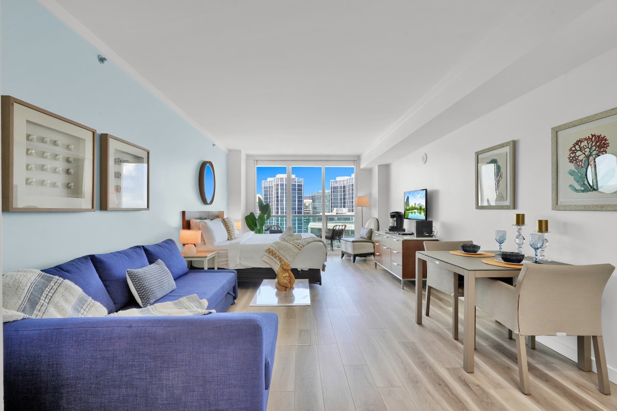 🌊 Studio mit Meerblick auf der 19. Etage im Hotel Arya in Coconut Grove 🌴 Studio • 4 Schlafplätze • Balkon • Zugang zum Pool und Fitnessraum • Meerblick Genieße von diesem hochstöckigen Studio im Hotel Arya einen atemberaubenden Blick auf das Meer und das Segelboot. Verfügt über ein Kingsize-Bett, ein Queensize-Schlafsofa, Verdunkelungsschirme und eine Balkontür mit Hurrikan. Genieße vollen Zugang zu den Annehmlichkeiten des Hotels wie dem Pool, dem Fitnessstudio und mehr - direkt im Herzen des fußgängerfreundlichen Coconut Grove!