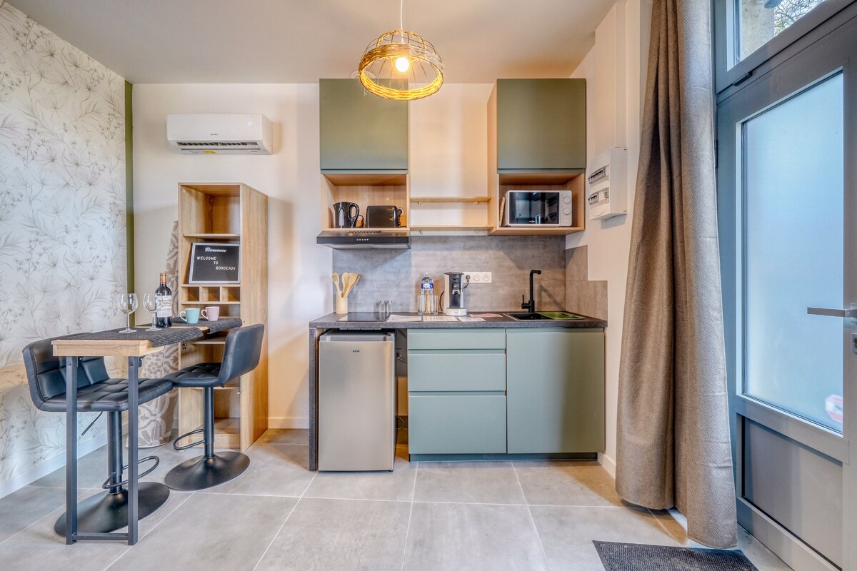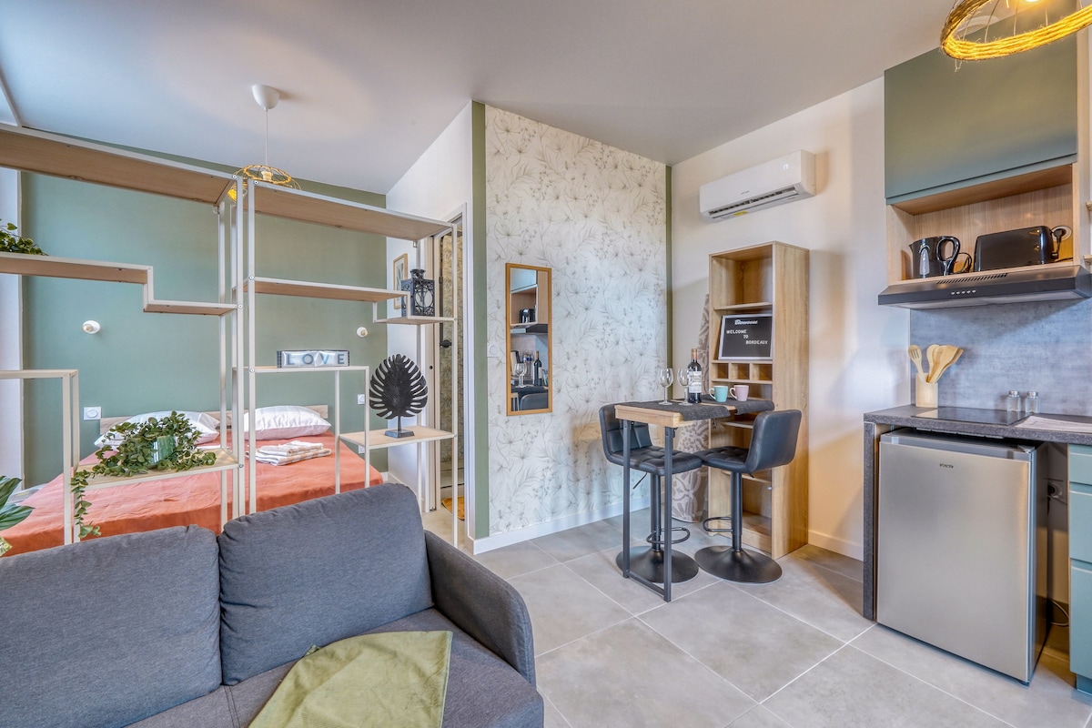 Découvrez un lieu cosy, dans un quartier vivant à deux pas de la gare, du centre et de tous les transports (Tram, Station vélo). Découvrez son jardin secret, à 2 pas du marché des Capucins, le ventre bordelais où vous dégusterez les produits de régions! Belle cuisine sur jardin, espace salon/chambre & mezzanine lit additionnel (plus adaptée aux enfants). Un style design, et très convivial. Vous avez en plus accès à l'espace coworking de la résidence La Cuisine de Camille ( sauf mois d'août)