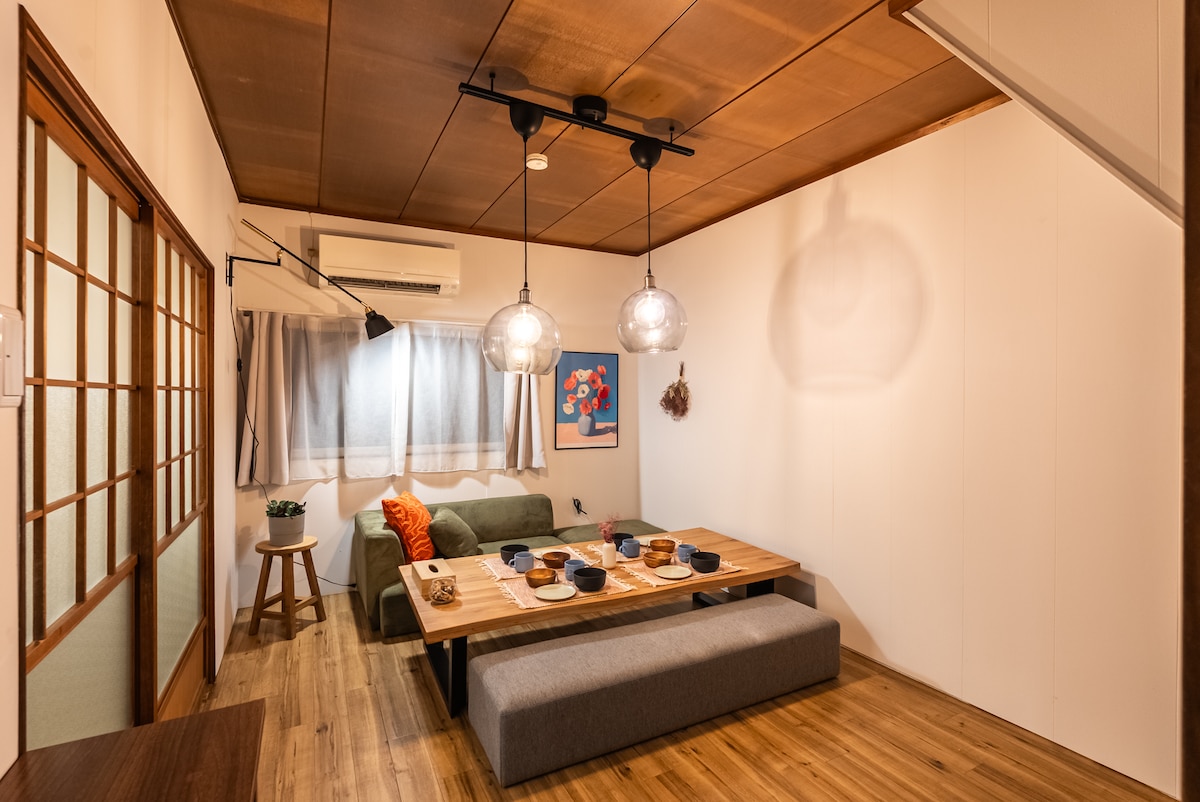 Dieses historische Haus aus dem Jahr 1909 befindet sich in Osakas Joto Ward und ist ein seltener Überlebender aus dem Zweiten Weltkrieg. Es wurde 2015 von einem renommierten Designer renoviert und erstreckt sich über 150° und verbindet historischen Charme mit modernem Luxus in einem ruhigen Rückzugsort im Stadtzentrum. Sein elegantes Design harmoniert Vergangenheit und Gegenwart und bietet kulturelles Eintauchen und geräumigen Komfort. Mit zwei Badezimmern, separaten Toiletten, Waschbecken und einer großen Badewanne sorgt es für Privatsphäre und Sauberkeit für Gruppen. Erlebe Kultur, Geschichte und Komfort, dein perfekter Aufenthalt in Osaka erwartet dich.