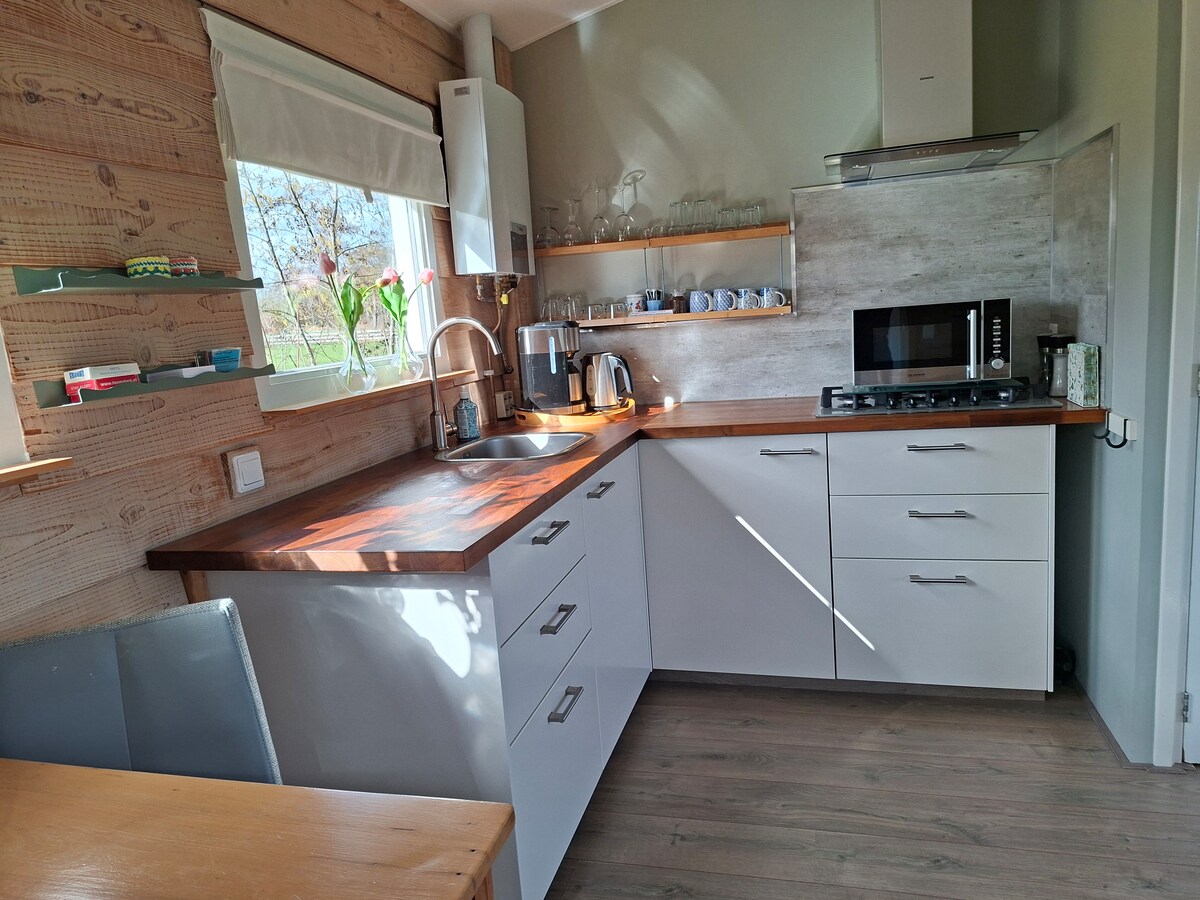 Vrijstaand gastenverblijf in het groen, met volop rust en privacy. Aan de rand van het bos, net buiten Assen, logeer je in een volledig zelfstandige woning met eigen entree en tuin. Vanuit de woonkamer kijk je uit over de landerijen en hoor je vooral vogels en wind. Hier combineer je de stilte van de natuur met het comfort van een modern en knus ingericht huisje.