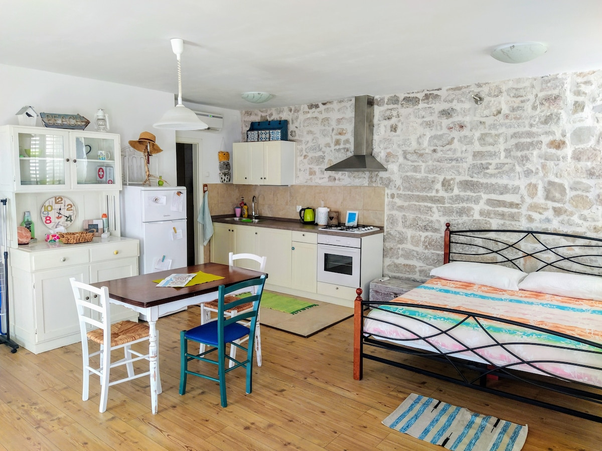 Eine charmante brandneue Studiowohnung in einem Familienhaus, das direkt am Strand liegt. Hier genießt du die ruhige Umgebung, einen charmanten Garten mit mediterranen Kräutern und den Grillplatz mit der Lounge, während du die Möglichkeit hast, buchstäblich in deinem Badeanzug zum Strand vor dem Haus zu gehen. Ein idealer Urlaubsort für Paare oder Freunde, während Babybett auf Anfrage zur Verfügung gestellt werden kann. Das Studio befindet sich im Hinterhof des Hauses und hat den privaten Eingang.