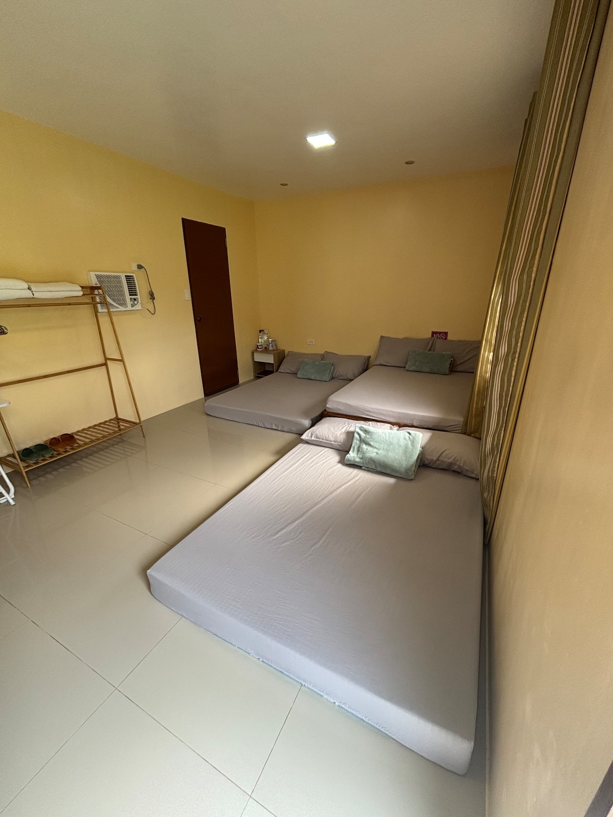 This spacious guest room features 1 queen-size bed and 1 double bed, comfortably accommodating up to 4 guests. It includes a separate living area with a TV and relaxing sofa, perfect for unwinding. The room is non-air-conditioned but equipped with electric fans for comfort. Guests have access to a basic toilet and bath (no hot and cold shower), high-speed Starlink internet, a garden area, a plunge pool, and a pickleball court for leisure and recreation.