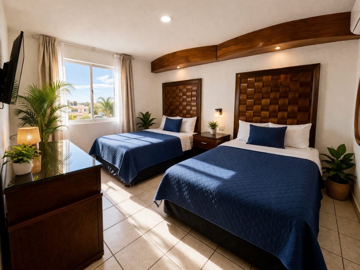 Habitación Ejecutiva Privada. Descanse como se merece, a un precio que sí conviene ✨. 🛏️ 2 camas matrimoniales, baño en la habitación, ropa de cama premium, TV, Wi-Fi y frigobar. ❄️ Minisplit para un ambiente agradable. 🍳 Cocina compartida totalmente equipada. 🌿 Áreas verdes. 🚗 Estacionamiento con cámaras. 🔐 Self check-in/out con cerraduras digitales. ☕ Snacks disponibles. 🧺 Lavandería equipada 📍 Frente a parque, cerca de zona industrial y vías rápidas. ✅ Qynd Hotel: la opción inteligente