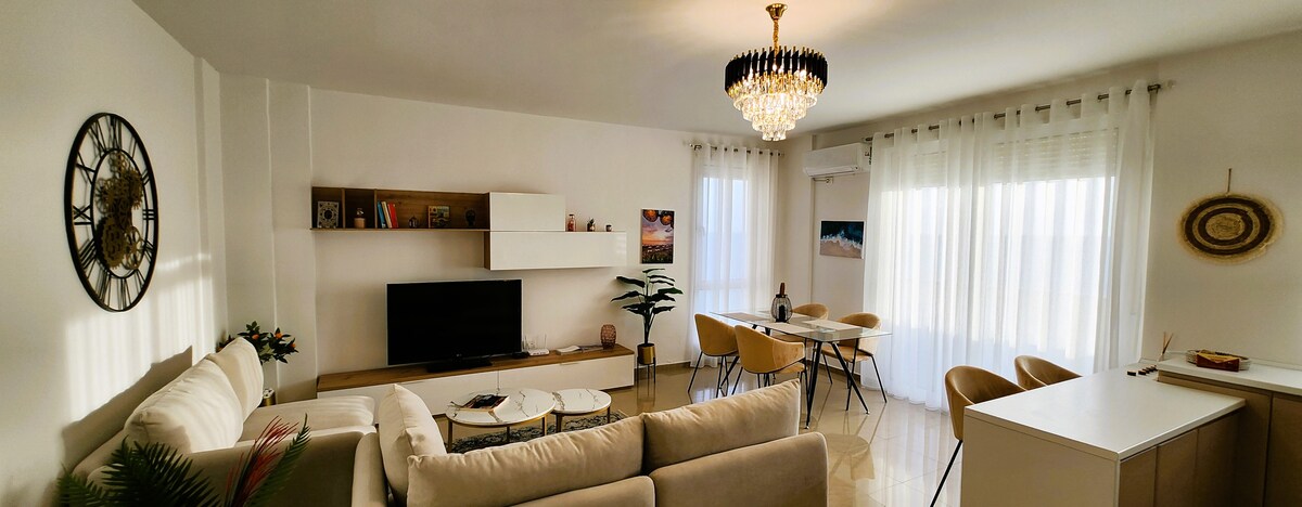 Stilvolle, helle Wohnung mit Designersanierung in der besten Gegend von Durrës — nur 100 m vom Sandstrand entfernt. Für romantische Ausflüge oder Alleinreisen ideal. Verfügt über einen eigenen Balkon, eine voll ausgestattete Küche, Klimaanlage in beiden Zimmern, Aufzug mit privatem Chip und sichere Parkplätze. In der Nähe von Cafés, Restaurants, Märkten und antiken Ruinen. Genieße das ganze Jahr über Komfort und Ruhe — sei es für einen Wochenendurlaub oder einen längeren Aufenthalt.
