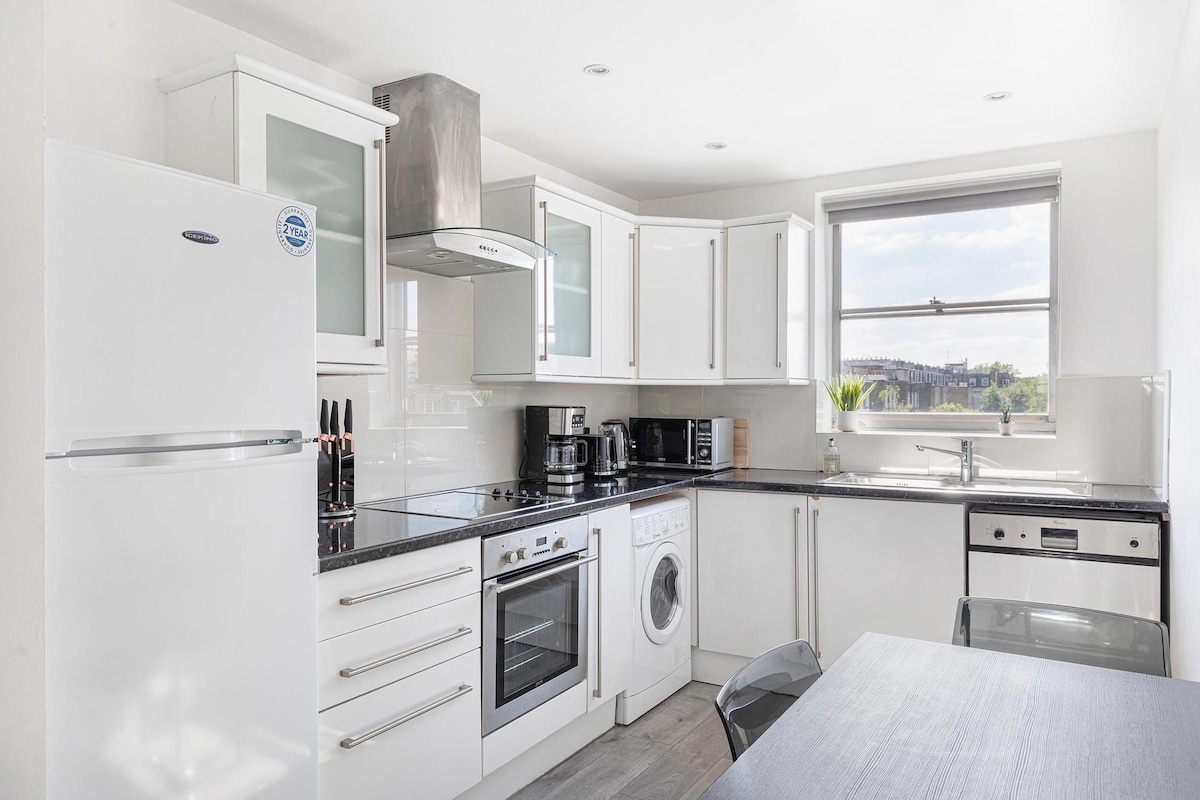 A beautifully presented luxury designer flat, recently renovated. Set in the Royal Borough of Kensington & Chelsea. One of London’s most prestigious and exclusive locations. Overlooking a Victorian garden square. High-spec kitchen features a Miele oven, instant boiling tap, induction hob, wine fridge and an island. Fast WiFi, workspace, USB‑C/USB‑A ports, in flat washer/dryer and a Samsung Frame Art TV, ideal for business travellers & couples. Nearby cafés, restaurants and museums.