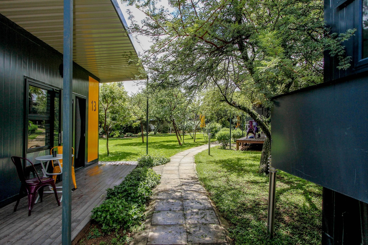 Gemütlicher 6m-Bachelor-Container mit einem Doppelbett, viel Stauraum, voll ausgestatteter Küchenzeile mit Minibar und einem privaten Braai-Bereich für entspannte Abende. Lichterketten sorgen nachts für eine romantische Atmosphäre. Genieße Streaming auf dem Flachbildfernseher, kostenloses WLAN und Solarenergie, damit du während des Load-Shedding in Verbindung bleibst. Ruhig und friedlich – keine laute Musik oder Partys. Selbstversorgung mit vollständiger Privatsphäre, aber wir sind immer nur einen Anruf entfernt, wenn du etwas brauchst.