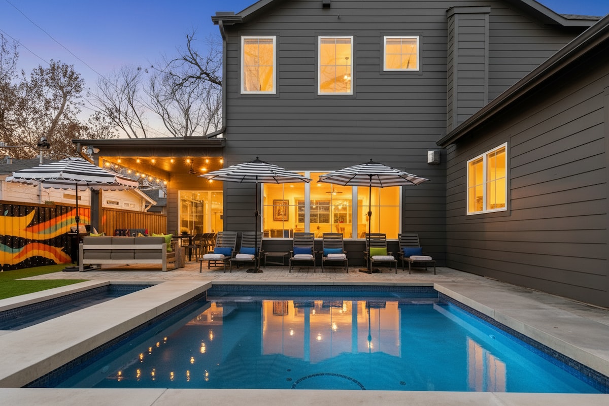 Nestled in vibrant East Austin, this newly built 4-bedroom home sits in a quiet and peaceful neighborhood—just 5 mins from Downtown, Rainey Street, and 6th Street’s lively bars and restaurants, 8 mins to UT & the Moody Center, and 10 mins to Zilker Park and Airport. Unwind in the backyard with a cowboy pool, outdoor movie setup, and BBQ dining area. Perfect for groups looking to explore the heart of Austin. Our home is all about creating memorable experiences for you and your family & friends!