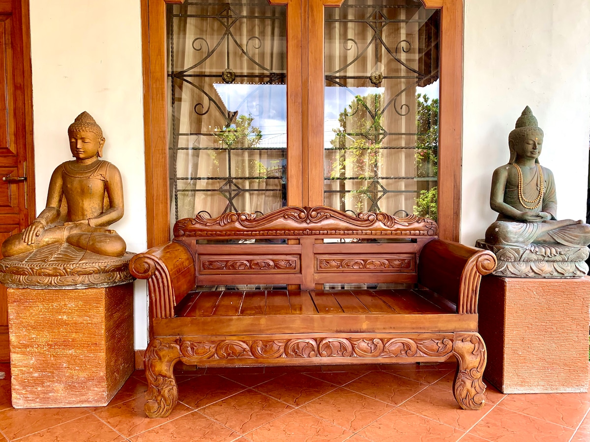 Das Santra Putra Guesthouse, das seit 1989 Reisende aus der ganzen Welt beherbergt, ist Teil von Wayan Karjas Kunststudio und Familienhaus. Sie befindet sich auf einem erhöhten Hügel auf der Westseite von Ubud im Dorf Penestanan Kaja. Dieses schöne Viertel ist bekannt für die „jungen Künstler“, versteckte Reisfeldwege, Yogastudios und tolle kleine Cafés. Es gibt keine direkte Autozufahrt; du musst ein bisschen laufen, was Teil des Charmes ist.