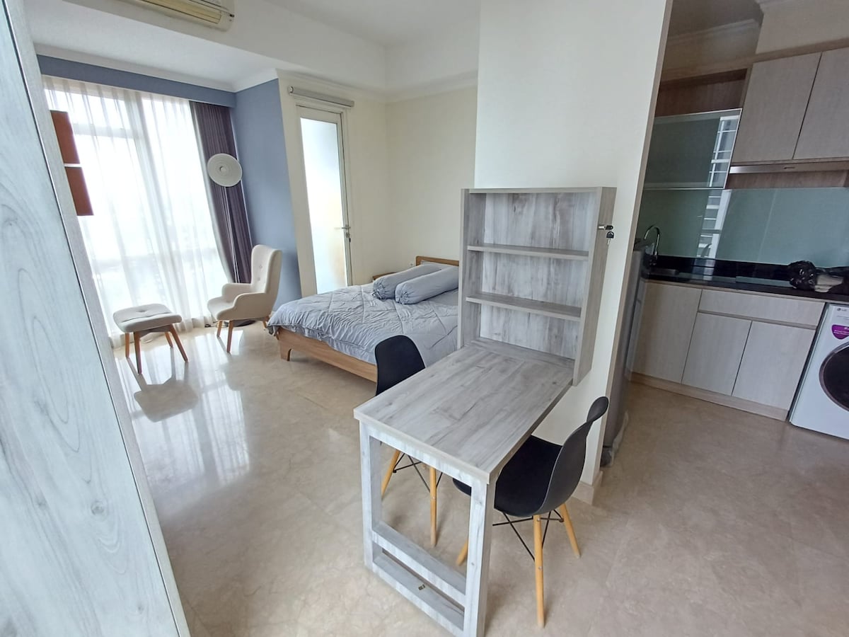 NEW EARLY CHECK IN 1 BedRoom 47m with bathtub 3 pax hotel quality with BALCONY BEST PRICE MENTENG PARK central jakarta *SELF CHECK IN *.it's perfect for long stay or short king size bed medical mattress NEW kitchen equipment for cooking washing machine best view high floor shiny building has best swimming pool and gym fully equipped market coffee shop restaurants luxurious reception free wifi and parking hygiene apartment TV NETFLIX iron and iron board coffee tea bags kettle microwave vacuum