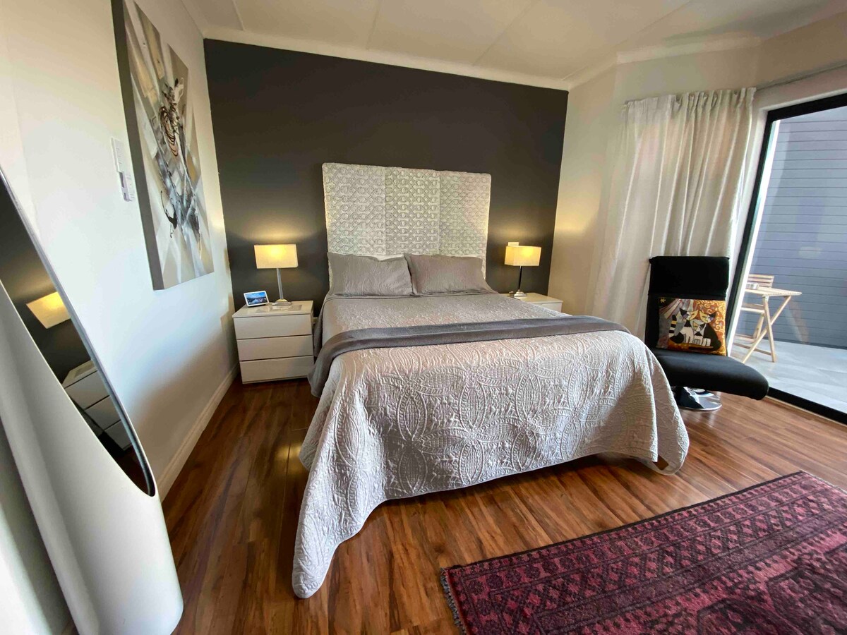 Enjoy the comfort of this modern, upmarket self-catering unit—spotlessly clean, secure, and elegantly finished. Ideal for up to 5 adults or a couple with children, it offers privacy and space in a peaceful, exclusive setting. The unit includes a queen bed with en-suite bathroom and two single beds, making it perfect for a small family or group. A stylish and convenient base for both relaxation and travel.