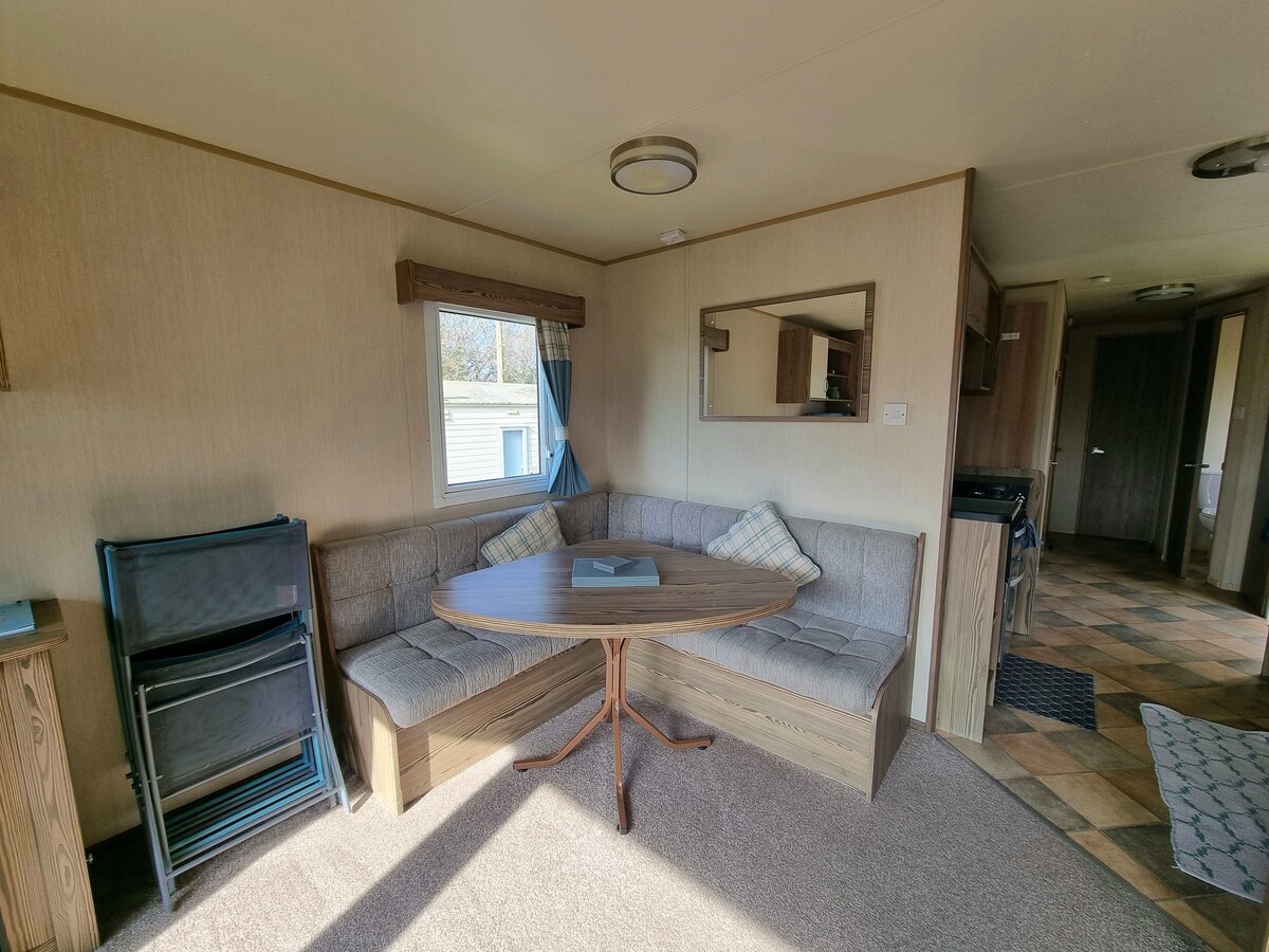 Geräumiger Wohnwagen im Combe Haven Holiday Park. Unser Ferienhaus bietet Platz für bis zu 6 Personen. Der Wohnwagen besteht aus 3 Schlafzimmern: einem Hauptschlafzimmer mit einem Doppelbett, zwei Zweibettzimmern mit Einzelbetten. Es gibt zwei Toiletten, eine größere mit Dusche und beheiztem Handtuchhalter, einen Essbereich, TV, einen offenen Küchenbereich mit Geschirrspüler, Kühlschrank mit Gefrierfach, Gasherd mit Backofen und Grill, Mikrowelle, Dolce Gusto-Maschine, Wasserkocher, Toaster. Der Wohnwagen ist doppelt verglast und in jedem Zimmer mit Ventilatorheizungen beheizt.