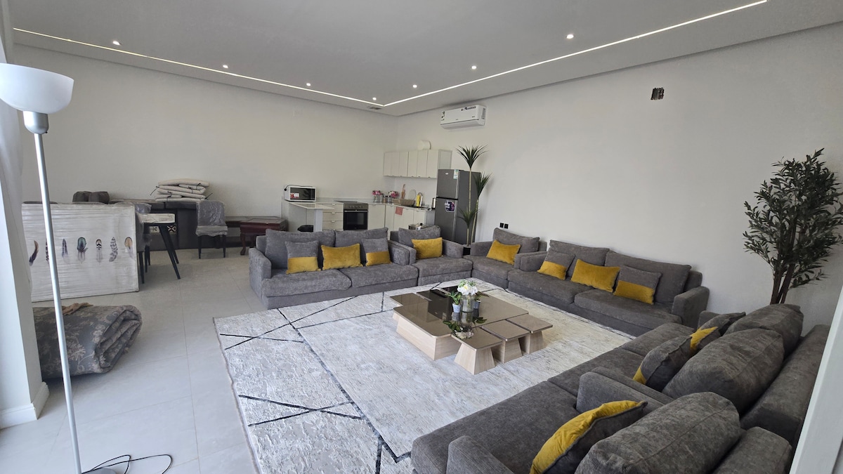 Vergiss deine Ängste in diesem geräumigen, ruhigen Raum. Lade deine Gäste in den Majlis ein, um ihnen die beste Gastfreundschaft zu bieten. Es gibt WLAN, eine Küche, ein Badezimmer mit Dusche, Tassen, Gläser, Wasser und einen großen Smart-Screen