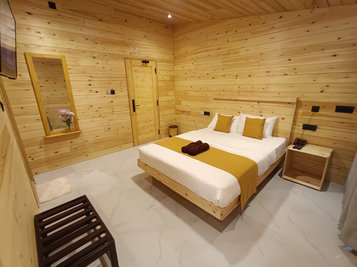 Willkommen in Arawe – Chalet, deinem privaten Rückzugsort, umgeben von üppigem Dschungel und Reisfeldern. Der Raum ist für diejenigen gedacht, die Stille, Verbindung und natürliche Schönheit suchen – ein handgefertigter Rückzugsort, der traditionellen sri-lankischen Charme mit achtsamer Einfachheit verbindet. Das Schlafzimmer bietet einen Panoramablick auf den Dschungel und lässt das Morgenlicht und die Waldbrise durchfließen. Das angeschlossene Badezimmer verfügt über Elemente aus Naturstein, eine Regendusche und eine Außendusche, die von viel Grün umgeben ist.