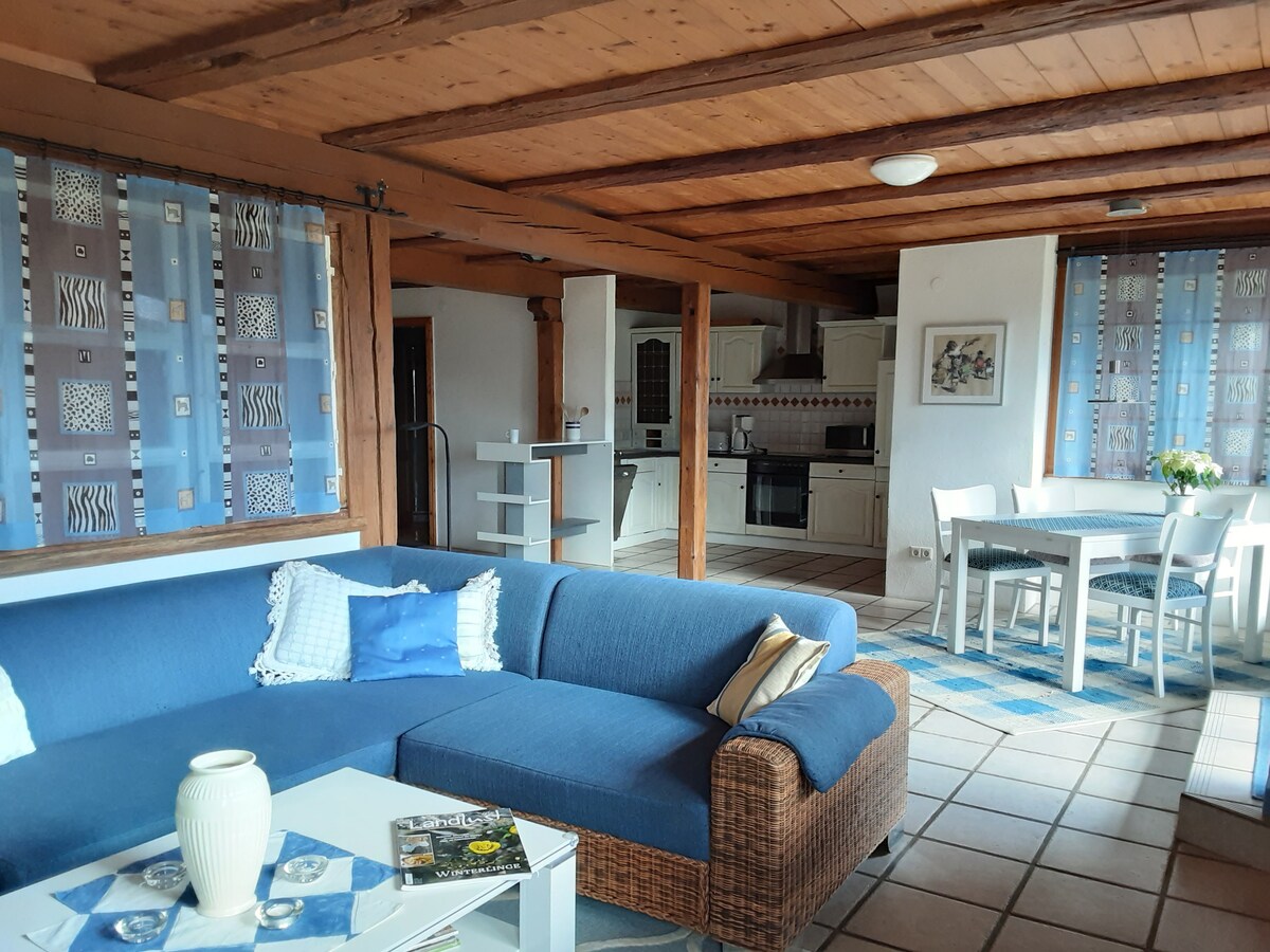 Die Wohnung ist ruhig gelegen, verfügt über einen eigenen Eingang und ist für 2 Personen, evtl. mit Kind, geeignet. Sie ist 70 m² groß, verfügt über ein großes Schlafzimmer mit einem 140x200 + 90x200 Bett. Der Wohnraum mit Küche ist mit Fernseher, Stereoanlage, einem Kaminofen und einem Esstisch ausgestattet. Der Kochbereich ist mit Herd, Backofen, Mikrowelle, Kühl/Gefrierschrank und reichlich Kochutensilien ausgestattet. Das Badezimmer verfügt über eine geräumige Dusche, WC und Waschmaschine