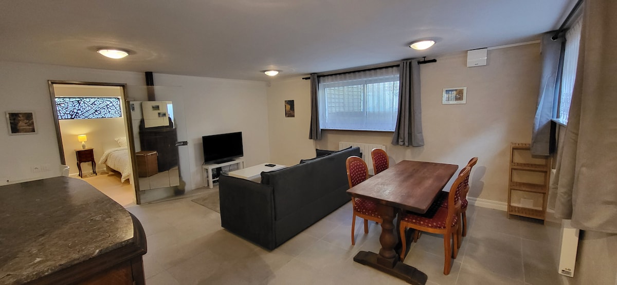 Appartement sous terrasse 2/3 pièces de 60 m² avec terrasse de 15 m² . L'appartement est privatif et dispose d'une entrée indépendante . Il est composé d'une cuisine équipée, d'un grand séjour, d'une petite salle de bains avec toilettes et lave main, douche italienne assise avec banc ainsi que d'une grande chambre ( lit king size) avec un coin salon. La terrasse dispose d'un salon de jardin. Parking gratuit dans la cour . Commodités et transport à proximité .