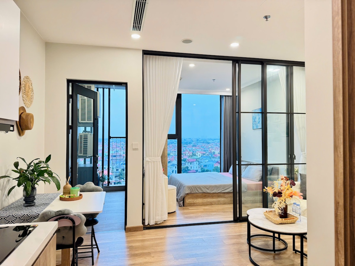 Landmark Onsen 🌿 Homestay – ein idealer Zwischenstopp im Herzen des grünen Ecoparks 🌿 Die Wohnung befindet sich im 24. Stock im Landmark 1 Onsen-Gebäude – dem modernsten und teuersten Ecopark, der sich durch ein Onsen-Heißmineralprogramm im Innenbereich auszeichnet – in dem du dich jeden Tag entspannen und neue Energie tanken kannst. Der Raum ist zart gestaltet, lichtdurchflutet, offen für den Blick auf Grün und See – sehr geeignet für Paare oder kleine Familien, die sich von der Straße verstecken möchten, um nach anstrengenden Tagen Ruhe und Frische zu finden