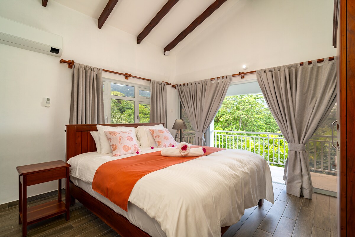 Ein geräumiger, ruhiger Rückzugsort mit weitem Meerblick – ideal für Familien oder kleine Gruppen. Genießen Sie die Veranda bei Sonnenuntergang als Ihren Wohnbereich im Freien, für Ruhe und Privatsphäre. Die Villa verfügt über eine vollständige Selbstversorgung und einen einfachen Zugang zur Küste. Wir organisieren Autovermietungen, Transfers und Gruppenausflüge nach Praslin und La Digue. Für entspannte Abende bereiten wir frische Mahlzeiten zu, die Sie nach Belieben aufwärmen können.