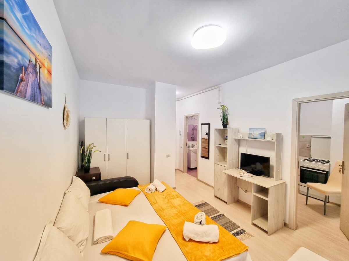 Studio BEL în cladire nouă, etajul 2/5 ,lift,la 5 minute de mers pe jos de plaja Acapulco, intim,utilat complet, modern,se poate asigura transferul de la gară gratuit,loc parcare, aquaparc în apropiere, supermarket-uri,ghid pentru obiectivele turistice,vacanța perfectă. Vă așteptăm cu drag!